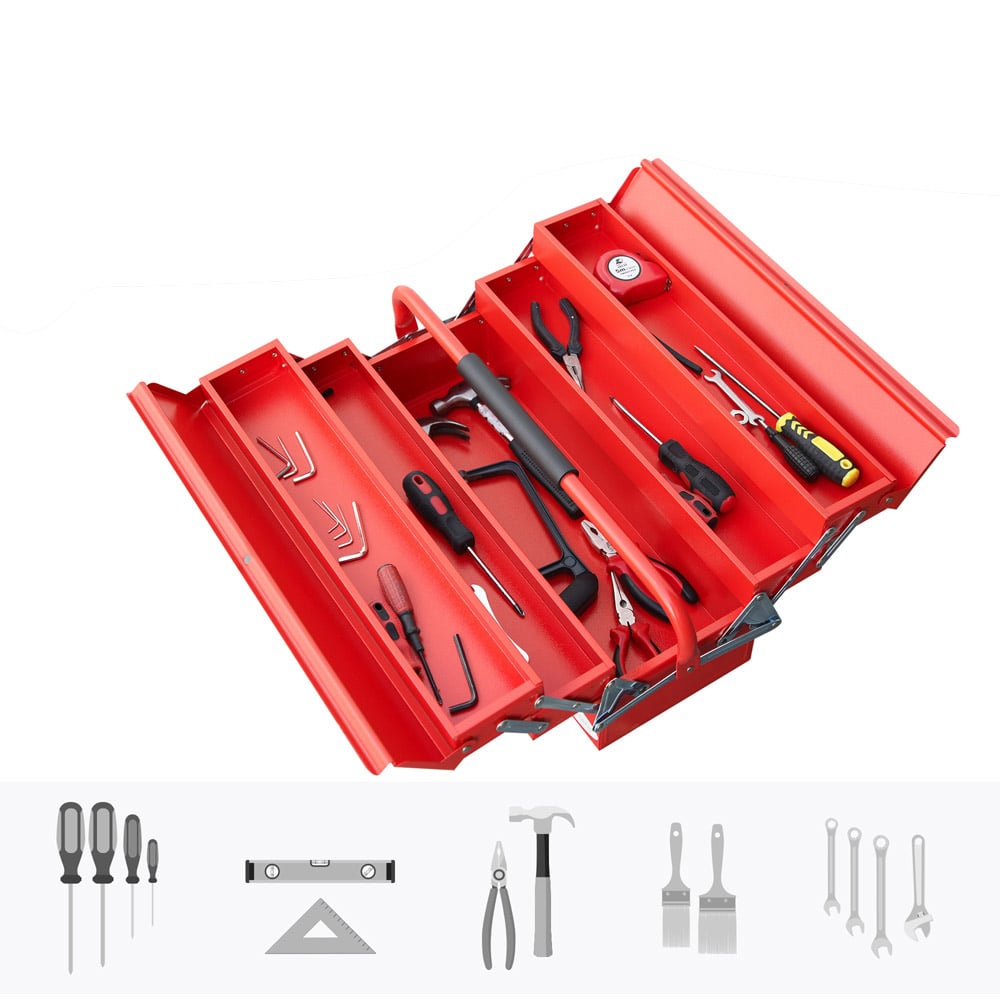 Keep all your DIY tools in one place with this Red 5 Tray Steel Tool Box from Durhand. Made from steel, the toolbox features a hard shell to make it perfect for everyday use. It opens up to reveal five storage trays, allowing you to store and organise everything you have easily. The toolbox also comes with a full-length handle to finish so you can carry it around easily. Get organised and make this smart addition to your workshops for better working.