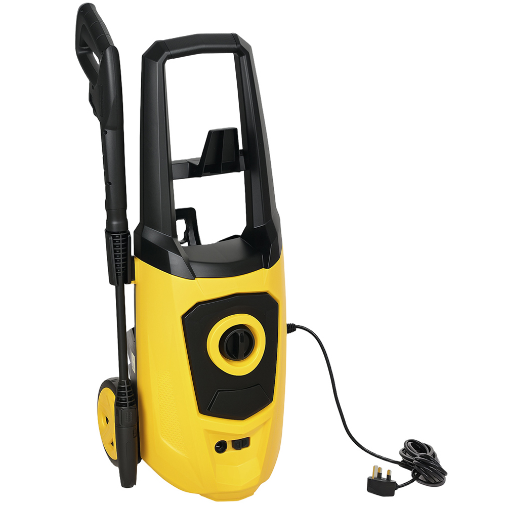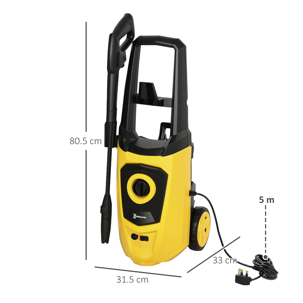 Easy home cleaning of stubborn tasks - this DURHAND portable pressure washer. 1800W motor, with a 150 bar pressure is powerful - provides 510 litres of water per hour. Deal with a variety of dirt and stains. You can adjust the nozzle angle between 0° and 75°, making it easy to direct the pressured water to a position you require. With the six-metre long hose, five-metre long power cord and wheels, you can move it around and reach long distances easily.