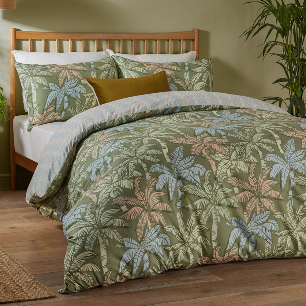 Introduce a sense of effortless sophistication to your bedroom with the Kentia Tropical Printed Duvet Cover Set. Crafted with a luxuriously soft touch and designed for easy care, this reversible set brings a touch of style to your space. One side showcases an exotic pattern of palm trees, evoking serene summer escapes, while the reverse offers a harmonious geometric design in understated tones, creating a versatile balance between playfulness and calm. The perfect choice for those seeking style and comfort, this bedding set transports you to faraway destinations, inspiring joy and relaxation every time you step into your room.