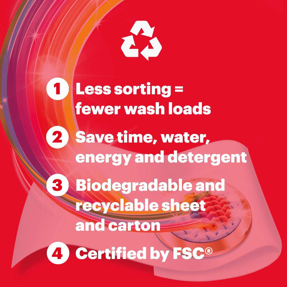 The new best-ever sheets offer the highest level of protection against colour runs Thanks to its unique texture with natural fibres, it maintains its shape during the wash to achieve stronger absorption of dye particles from the wash water. Each anti-transfer sheet is treated with special ingredients that act like a magnet protecting your clothes by trapping loose dye and dirt during the wash - The proof is on the sheet! Protection - The sheet acts as a magnet to trap loose dye, assuring maximum protection against discolouration and colour runs Mixed washes: Colour Catcher allows you to wash all colours together, even with whites, saving you time and money Brighter Colours: Dirt build-up becomes visible over time. By removing loose dirt particles from your wash, the sheet protects the fabric from greying All temperatures: The extra absorbent fibres of the sheet provide maximum protection at all temperatures. For best results use Colour Catcher in every wash Features: The new best-ever sheets offer the highest level of protection against colour runs Each anti-transfer sheet is treated with special ingredients that act like a magnet protecting your clothes by trapping loose dye and dirt during the wash - The proof is on the sheet! Thanks to its unique texture with natural fibres, it maintains its shape during the wash to achieve stronger absorption of dye particles from the wash water. Directions: 1. Place the sheet at the back of the machine drum before laundry 2. Add laundry and detergent, and start the wash cycle as usual 3. Remove sheets and clothes immediately after washing cycle Suitable for hand machine washing, all temperatures, cycles and fabrics. Safe for dryer Box Contains: 3 x Dylon Colour Catcher Sheet, 40 Sheets.