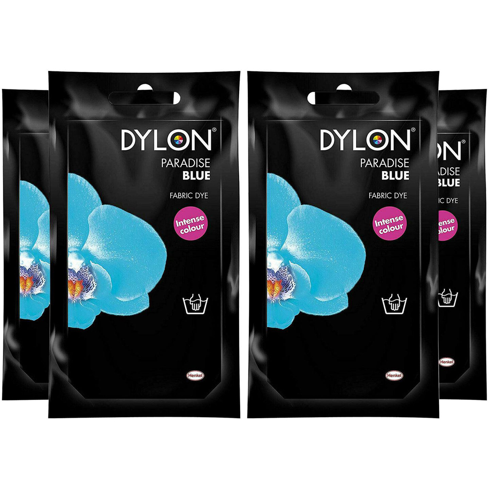 DYLON Hand Fabric Dye Sachet, Paradise Blue, 4 Packs of 50g DYLON Fabric Dyes for hand use are perfectly suited for smaller items like shorts, vests or socks, and for delicate you'd rather not put in the machine like wool and silk. Unleash your creativity with 19 intense shades. Provides permanent colour on a variety of textiles. Create unique items or up-cycle old ones. Dyes up to 250g of fabric (full shade) - 250g of salt required. Perfect for crafts and delicate materials. Unleash your creativity with DYLON Hand Dyes. DYLON Fabric Dyes are an easy way to add colour and create your own style in your home and wardrobe. From all colours bright and beautiful to rich and intense shades, with DYLON you have all the colours of the world to choose from. These fabric dyes for hand use are perfectly suited for smaller items like shorts, vests, gloves or scarves, and for delicates, you'd rather not put in the washing machine like wool and silk. For perfect, long-lasting and intense colour results. Sustainability - The dyeing process with DYLON with 3 warm wash cycles consumes 60 litres of water. The production of a single pair of new jeans consumes about 8000 litres of water primarily for the production of cotton and the irrigation of the fields. Note: Use with Pre-Dye if you want to change from one strong colour to another or if you want to achieve a lighter colour.