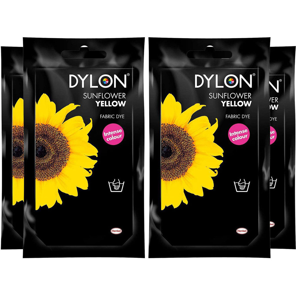 DYLON Hand Fabric Dye Sachet, Sunflower Yellow, 4pk of 50g DYLON Fabric Dyes for hand use are perfectly suited for smaller items like shorts, vests or socks, and for delicates you'd rather not put in the machine like wool and silk. Unleash your creativity with 19 intense shades. Provides permanent colour on a variety of textiles. Create unique items or upcycle old ones. Dyes up to 250g of fabric (full shade) - 250g of salt required. Perfect for crafts and delicate materials. Unleash your creativity with DYLON Hand Dyes. DYLON Fabric Dyes are an easy way to add colour and create your own style in your home and wardrobe. From all colours bright and beautiful to rich and intense shades, with DYLON you have all the colours of the world to choose from. These fabric dyes for hand use are perfectly suited for smaller items like shorts, vests, gloves or scarves, and for delicates, you'd rather not put in the washing machine like wool and silk. For perfect, long-lasting and intense colour results. Sustainability - The dyeing process with DYLON with 3 warm wash cycles consumes 60 litres of water. The production of a single pair of new jeans consumes about 8000 litres of water primarily for the production of cotton and the irrigation of the fields.
