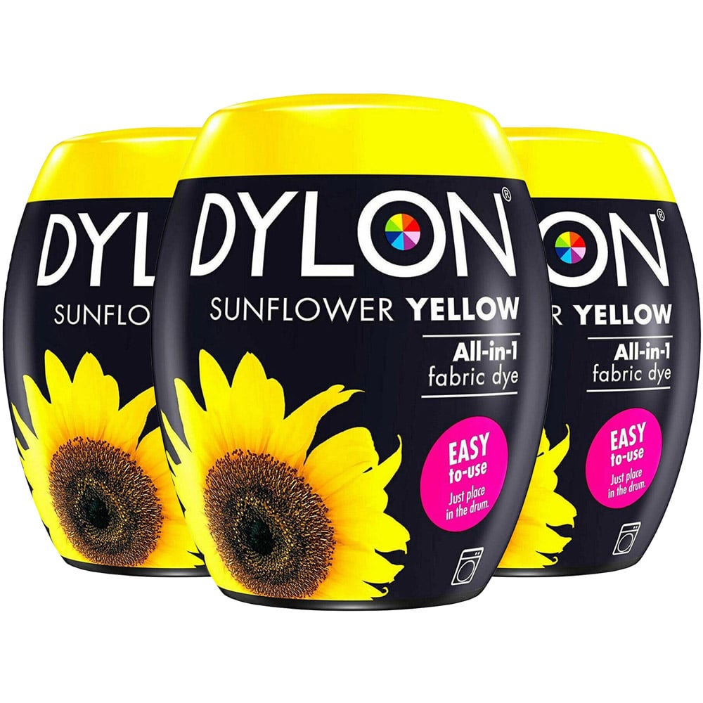 DYLON Washing Machine Fabric Dye Pod, Sunflower Yellow, 3 Packs of 350g DYLON Fabric Dyes are an easy way to add colour to your home and wardrobe. From all colours bright and beautiful to rich and intense shades The all-in-1 formula can revive or change the colour of your clothes and soft furnishings with ease, providing perfect, long-lasting and intense colours This fabric dye pod is completely safe for your washing machine and 1 pod can dye up to 600g of fabric for the full shade effect, Suitable for cotton, linen & viscose. Mixes with synthetics will dye to lighter shades (pure synthetics will not dye) Item does not have an expiry date, rather date mentioned on the product is the manufacturer's date.. Use with Pre-Dye if you want to change from one strong colour to another or if you want to achieve a lighter colour.