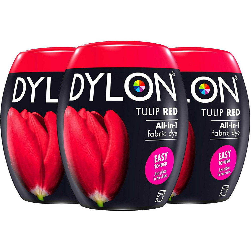 DYLON Washing Machine Fabric Dye Pod, Tulip Red, 3 Packs of 350g DYLON Fabric Dyes are an easy way to add colour to your home and wardrobe. From all colours bright and beautiful to rich and intense shades The all-in-1 formula can revive or change the colour of your clothes and soft furnishings with ease, providing perfect, long-lasting and intense colours This fabric dye pod is completely safe for your washing machine and 1 pod can dye up to 600g of fabric for the full shade effect, Suitable for: cotton, linen & viscose. Mixes with synthetics will dye to lighter shades (pure synthetics will not dye) Item does not have an expiry date, rather date mentioned on the product is the manufacturer's date. Use with Pre-Dye if you want to change from one strong colour to another or if you want to achieve a lighter colour How to use: 1. Remove the pod's outer sleeve and peel off the lid. 2. Put damp fabric into the machine drum and put the DYLON colour pod on top of the fabric. 3. Run a full cycle at either 30 or 40 degrees Celsius. Once the cycle has finished, run another 40-degree cycle with your normal detergent 4. Recommended to run an empty cycle with detergent to ensure all dye is clear from the washing machine. Always read full instructions before use. Note: Use with Pre-Dye if you want to change from one strong colour to another or if you want to achieve a lighter colour.