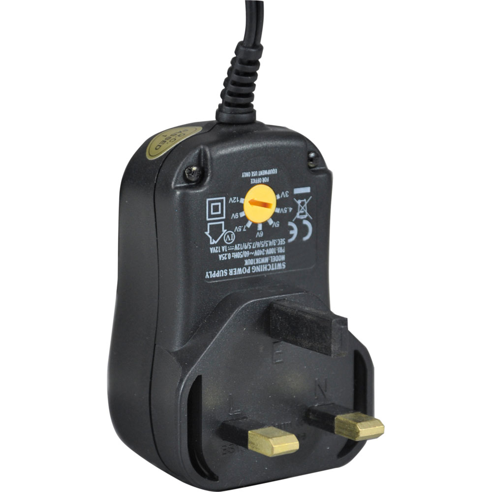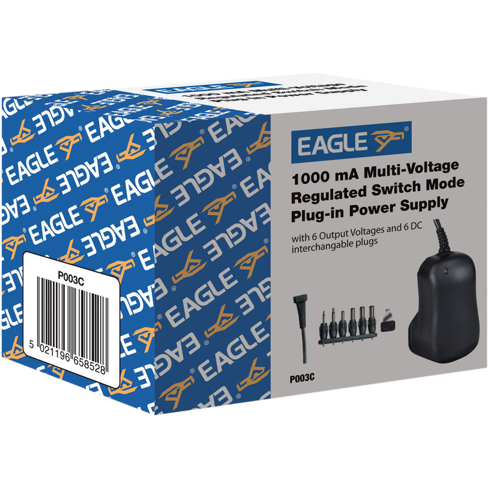 Smartly designed, this Eagle 1000MA Regulated Switch Mode Power Supply UK Plug in black will make a practical addition to any household. It comes complete with eight DC interchangeable plugs including 2.5, 3.5, 2.35 x 0.75, 3.5 x 1.35, 4.0 x 1.7, 5.0 x 2.1, 5.5 x 1.5, 5.5 x 2.5 plugs, for use with a host of modern portable appliances. Additionally, this plug-in regulated power supply with 3-12 V DC switchable output also features selectable polarity, LED indicator, IC-regulated DC output, short circuit protection and automatic overload cut-off for added convenience.