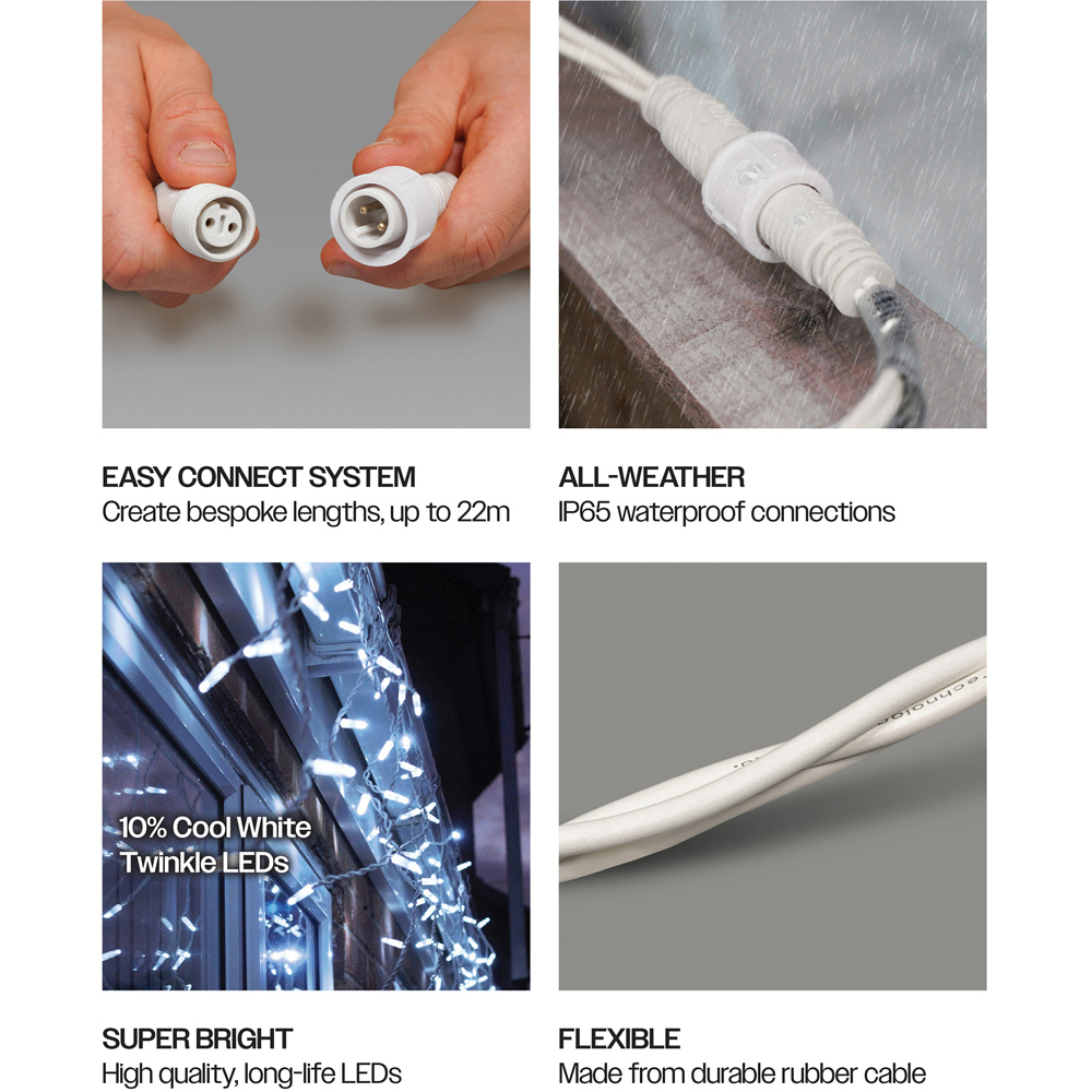 Give your home a festive glow with the Eagle Connect 360 Cool White LED White Icicle Light 13m. This light is manufactured with durable rubber cables and is built to withstand the elements, making it a top choice for all-season use. From sunny summer days to chilly winter nights, this LED light will keep your outdoor space looking bright and beautiful year-round. This light also features drops of 20cm, 40cm, and 60cm, adding a dynamic touch to your decor. From sunny days to frosty winter nights, this weather-resistant light will keep your outdoor space shining brightly. This versatile, weather-resistant light easily brings a touch of magic to any occasion and can be used indoors or outdoors for long-lasting illumination. Illuminate your space with versatile mains voltage light systems. Adding more connectable lights to an existing starter cable allows you to easily customise the length to fit your needs. The lights come in multiples of 2m and 5m lengths, allowing you to create the perfect ambience for any room or occasion. You can simply order the total length required and you will get the right combination of lengths to complete your setup. This light features quality, long-life LED bulbs which are energy-efficient and durable.