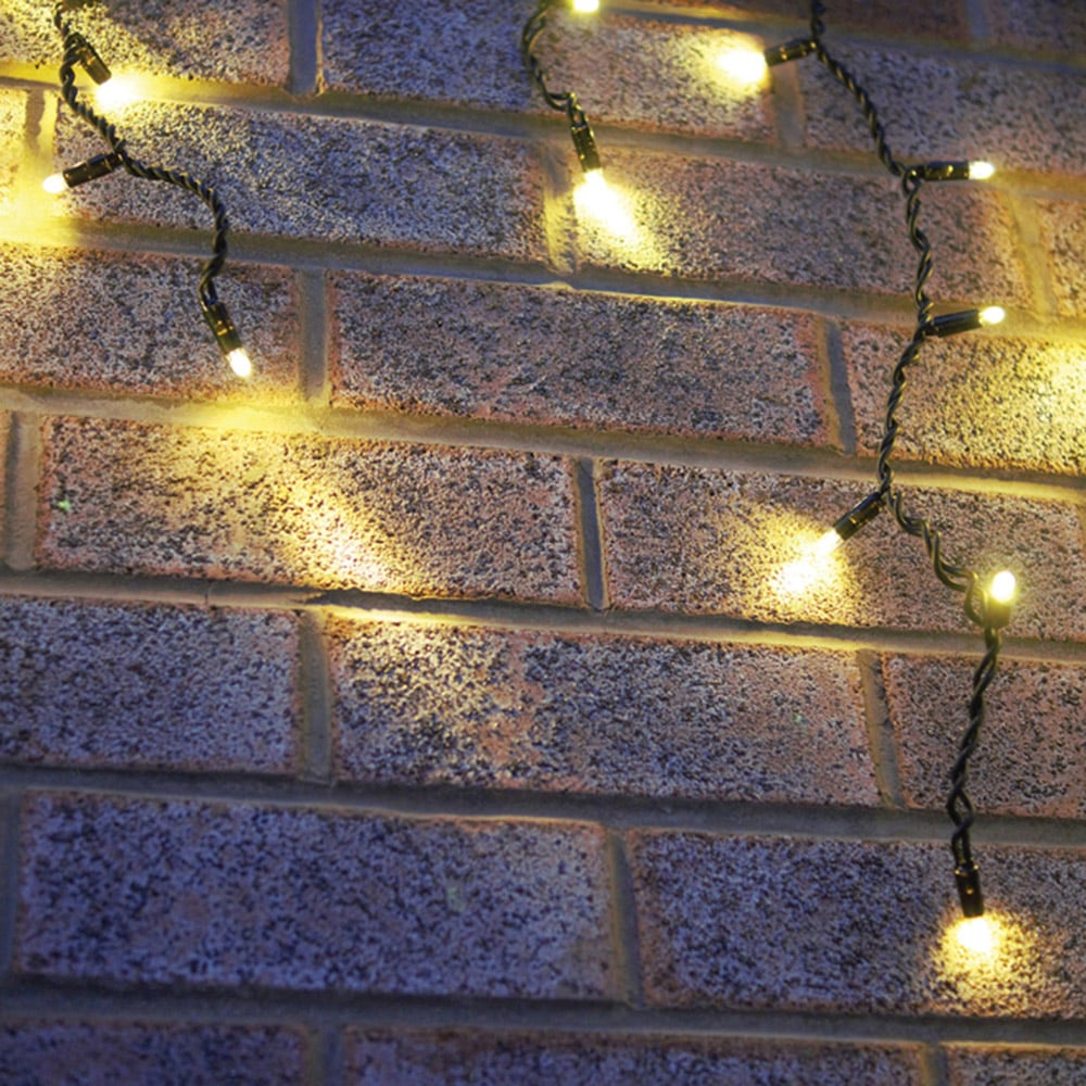 Brighten up your home and make every occasion sparkle with the Eagle Connect Warm White LED Black Icicle Light 11m. Manufactured with a tough rubber cable and This 11m icicle light is designed to withstand all types of weather, making it a perfect choice for year-around use. This light also features drops of 20cm, 40cm, and 60cm, adding a dynamic touch to your decor. From sunny days to frosty winter nights, this light will keep your outdoor space shining brightly. This versatile, weather-resistant light easily brings a touch of magic to any occasion and can be used indoors or outdoors for long-lasting illumination. The light comes in two metre mains lead, making it easy to achieve the ideal look for any room or setting. The easy connect system allows you to add more lights to an existing starter cable, customising the length to suit your needs. The warm white colour creates the perfect atmosphere for any occasion.
