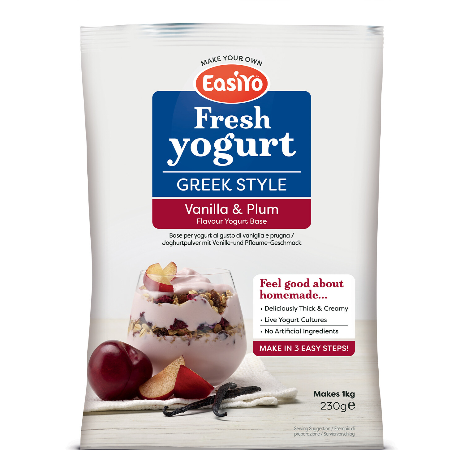 EasiYo Vanilla & Plum Greek Style Yoghurt Base features notes of juicy plum and sweet vanilla to make the perfect homemade yoghurt. This yoghurt base is easy to make and has a deliciously thick and creamy texture for indulgence. Each serving contains millions of live yoghurt cultures that are good for the gut, and there are no artificial ingredients, so you can feel good about your homemade yoghurt, which is great for breakfast and snacks!