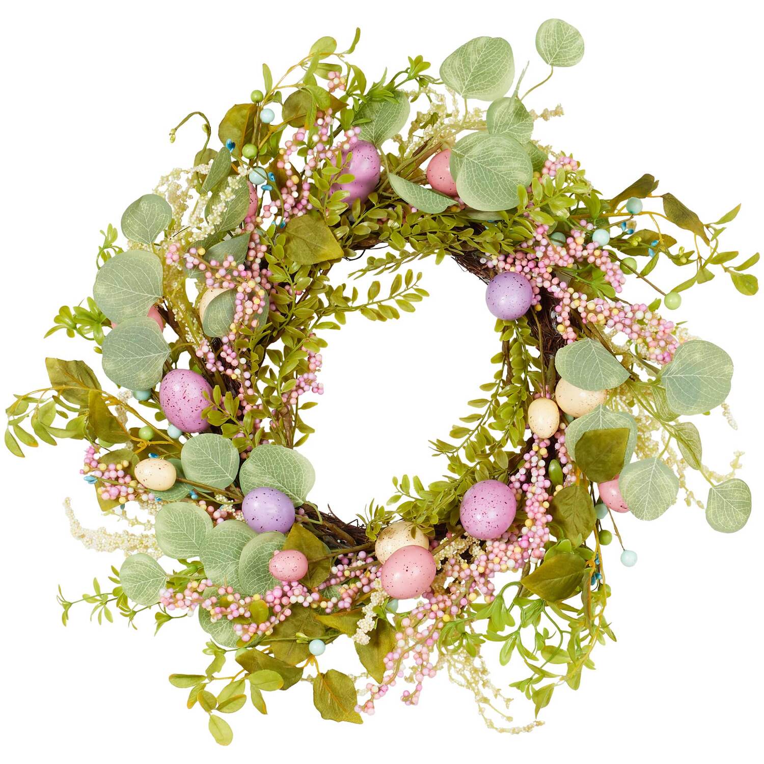 Spruce up your home for spring with this stunning 58cm Easter Wreath. Featuring pastel eggs, fun faux floristry and artificial leaves, the statement piece will elevate any space within your home with a pop of colour and springtime magic. This is a gorgeous addition to your home and is quick and easy to hang on your doors, windows, or walls.