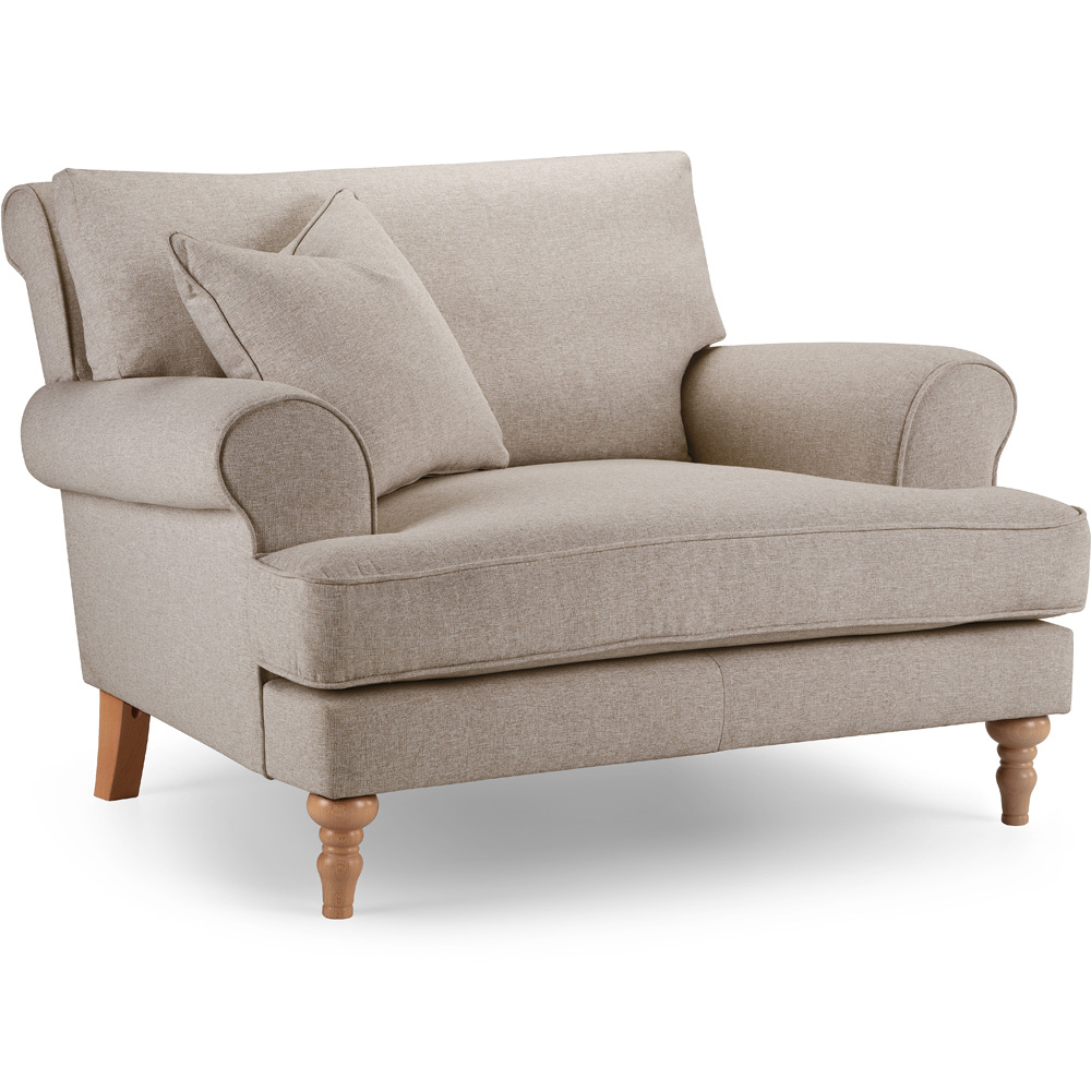 This Eastwood Faro Beige Snuggle Chair offers a contemporary take on a timeless classic. Featuring a deep scroll back, elegantly tapered arms, and turned wooden legs, it beautifully balances traditional charm with modern sophistication. Upholstered in a stylish slub weave fabric, this sofa makes a stunning statement. Designed for comfort, it boasts a deeper, low-slung seat perfect for lounging and comes complete with coordinating scatter cushions.
