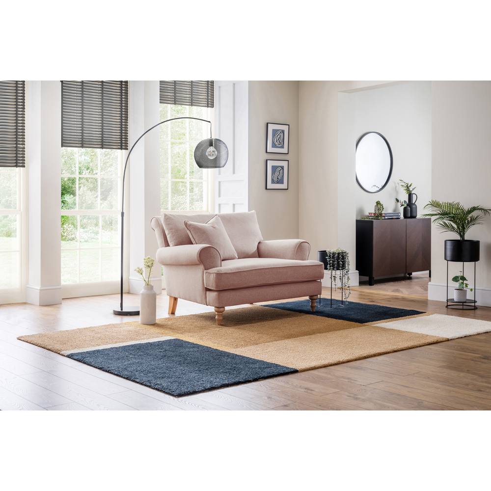 This Eastwood Faro Soft Pink Snuggle Chair offers a contemporary take on a timeless classic. Featuring a deep scroll back, elegantly tapered arms, and turned wooden legs, it beautifully balances traditional charm with modern sophistication. Upholstered in a stylish slub weave fabric, this sofa makes a stunning statement. Designed for comfort, it boasts a deeper, low-slung seat perfect for lounging and comes complete with coordinating scatter cushions.