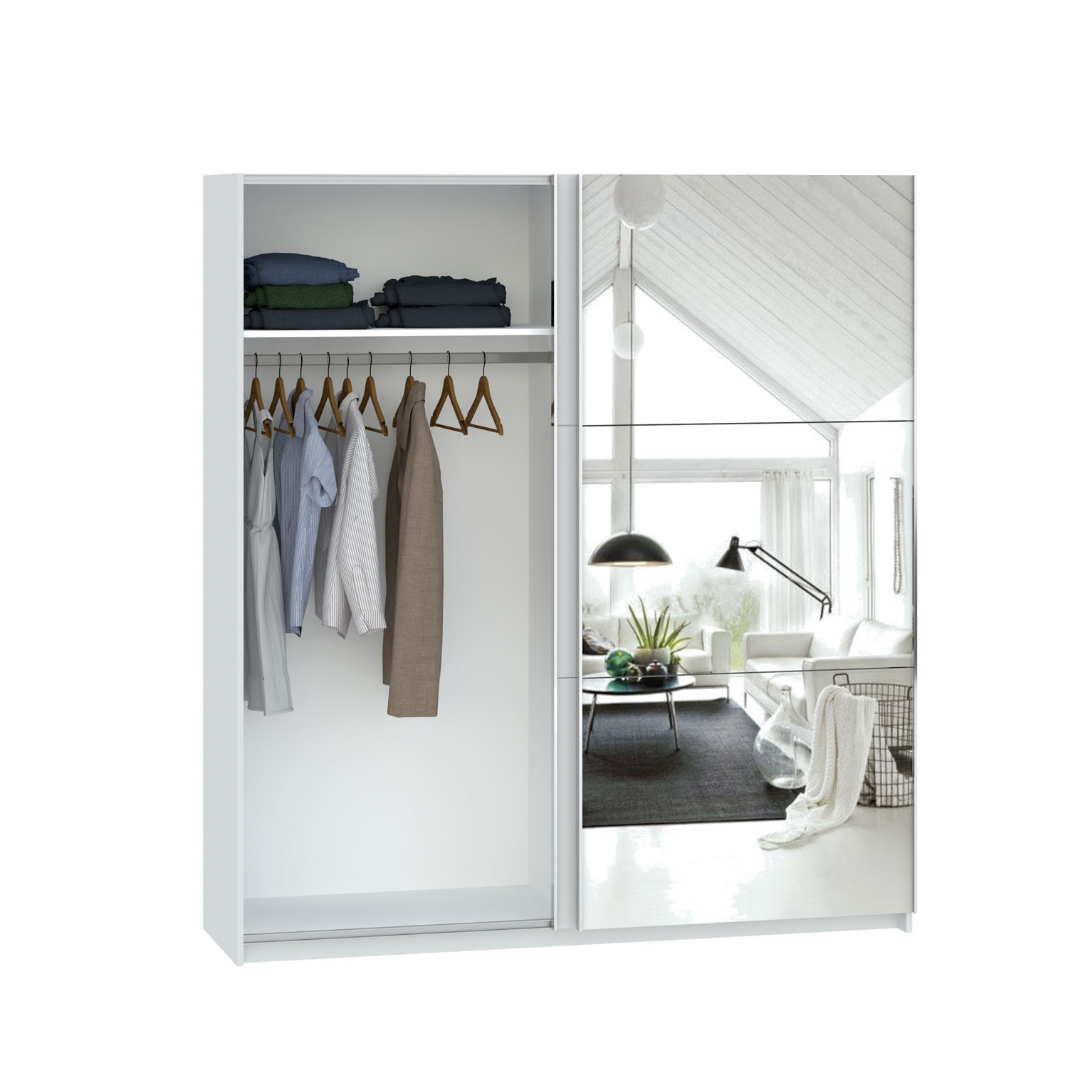 This Echo 2 Door White Wide Large Sliding Mirror Wardrobe is an extension of the ever-popular Echo collection. Featuring a sleek white matte finish and sliding doors, this contemporary wardrobe is sure to look stunning in your space. This desirable piece of bedroom furniture features a mirrored panel on one door that can be slid to either side of the wardrobe. It also includes a hanging rail for your clothes and a shelf that can be used for storing accessories, shoes, and bags. Easy to coordinate thanks to its simple yet sophisticated design, it will make a spectacular centrepiece for your bedroom whilst helping you keep it neat and organised.
