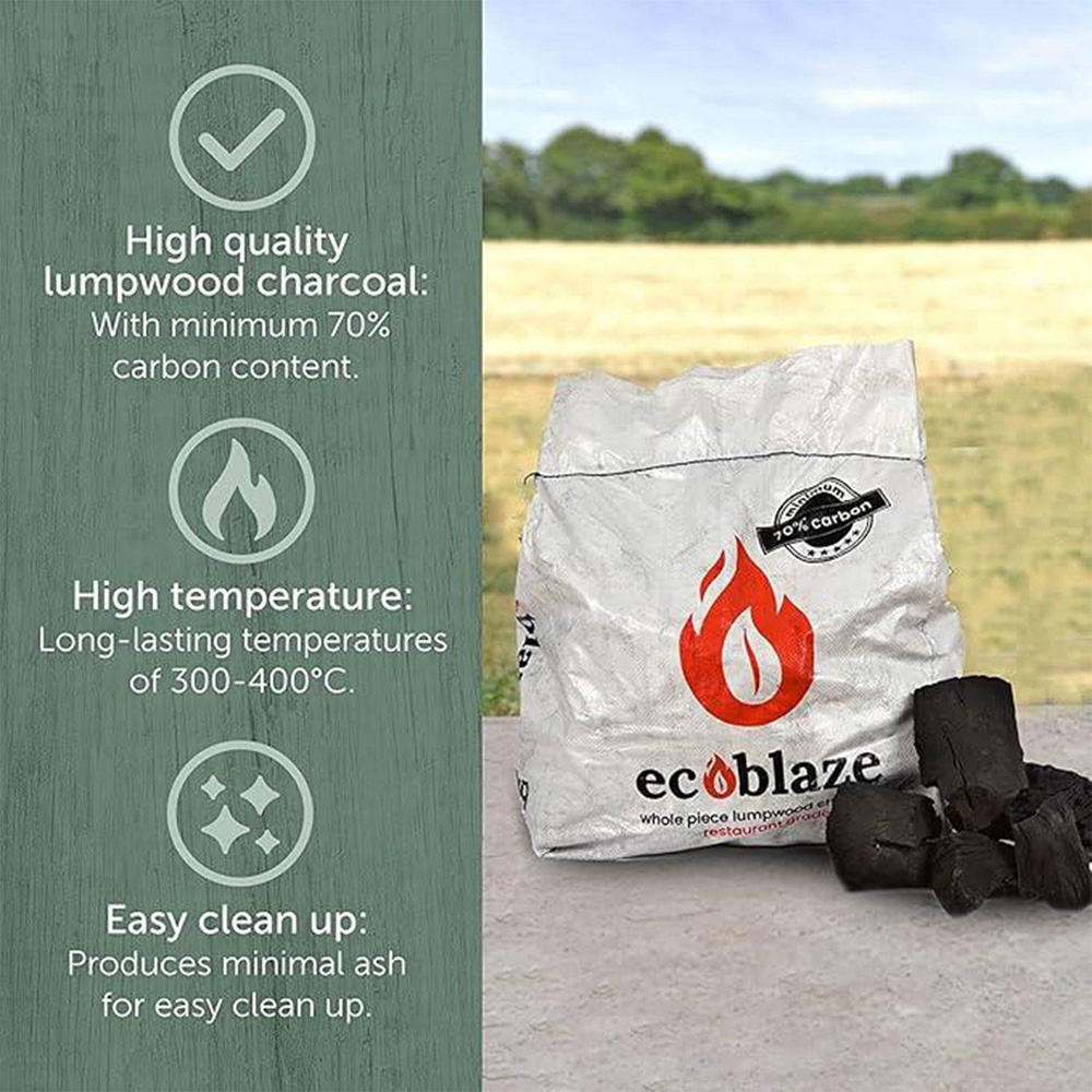 Ecoblaze Lumpwood Charcoal 20kg Bag Restaurant Grade with Minimum 70% of Carbon. Our Ecoblaze high-quality whole piece lump wood charcoal is very dense with minimum 70% carbon content. Leaving you with less smoke and providing you with an effortless cooking experience. The suitable appliances for this product are, grills, pizza ovens, BBQs, tandoor ovens, rotisseries and smoking pits. This Lumpwood charcoal is easy to handle, quick to light and burns for hours once lit, guaranteeing you long-lasting temperatures of 300-400C to help cook your food to perfection. Heat starts to build as soon as you light the charcoal. Provide the most delicious meals when using this Lumpwood Charcoal. Suitable and perfect for cooking, meat, vegetables, burgers, steak, chicken, fish, and more on a BBQ. It is ideal to help create your favourite dishes. Brilliant for BBQ enthusiasts, professionals, chefs, restaurants, home use, and gatherings.