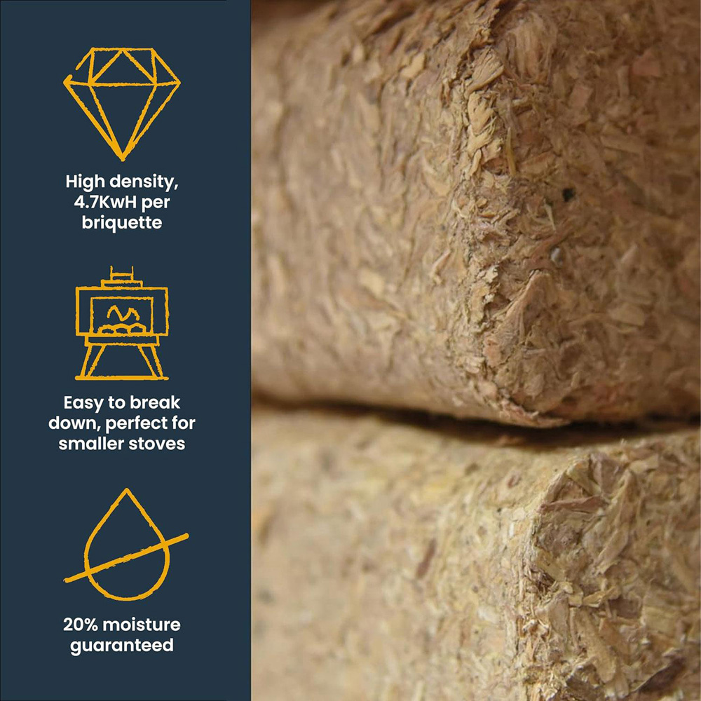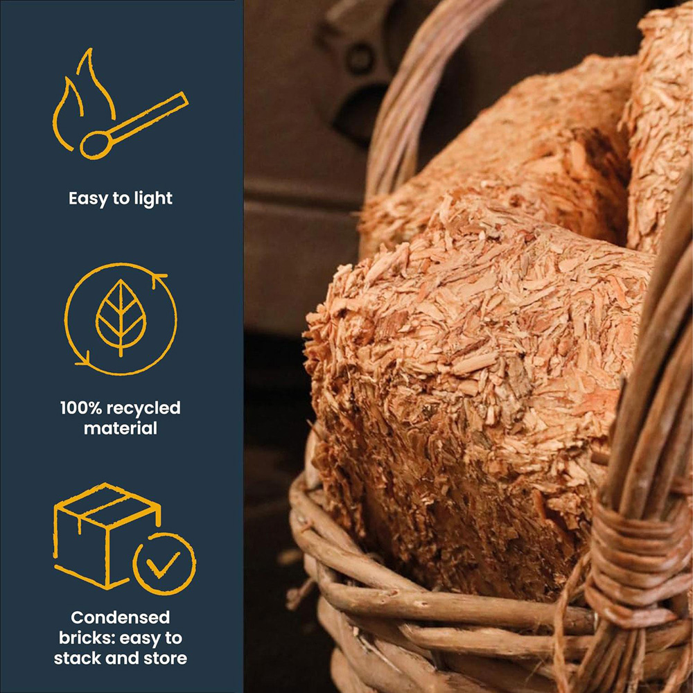 Ecoblaze RUF 1x 10kg bags (12 briquettes in total). The Ecoblaze RUF Fire Block is Europe's most popular and best-value briquette product. It's easy to handle and is the perfect product to keep your fire going. One main fantastic feature is its easy ignition making it effortless for you to start your fire. It is easy to store due to its chunky and compact design meaning that you can stack these heat blocks. It has a high calorific value for an efficient long-lasting burn, is carbon neutral and has a long-lasting heat log. RUF briquettes are made from recycled organic hardwoods. The measurements are 6.5cm x 15cm for each block making them strong, sturdy blocks. The wood fuel is kiln-dried and compressed into an energy-dense, brick-shaped heat block which can be broken up easily for convenient fire lighting, ideal for smaller stoves. These Ecoblaze RUF Fire Blocks are perfect for, wood burners, firepits, fireplaces, multi-fuel stoves, pizza ovens, camping, closed appliances and chimineas.