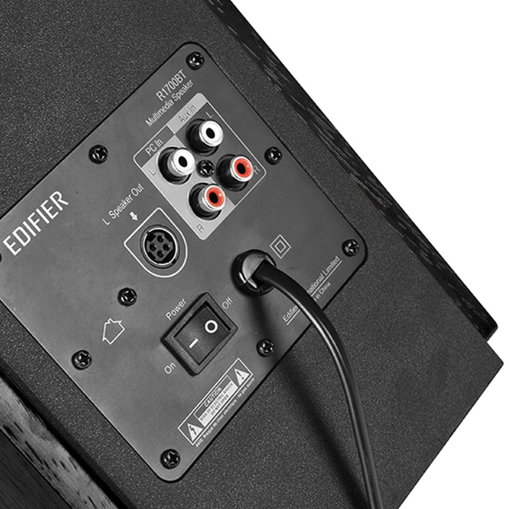 The Edifier R1700BT bookshelf speakers are a powerful audio solution with 4 driver units that can deliver an impressive 66 watts (RMS) output power, ensuring that your room is filled with your favourite music in high quality. Featuring a high-performance Class-D amplifier system with Digital Signal Processing (DSP) and Dynamic Range Control (DRC), these speakers are finely tuned to provide exceptional sound quality. The two 4-inch mid-range/bass drivers deliver rich lows, while the two F19mm silk diaphragm treble drivers produce crisp highs for a balanced audio experience. The MDF enclosure of the Edifier R1700BT not only looks stylish but also serves a functional purpose by reducing distortion and minimizing acoustic resonance. The 10-degree incline of each speaker base ensures dynamic precision and delivery, directing sound straight to your ears for an immersive listening experience. With Bluetooth V5.1 connectivity, these speakers offer strong resolution, stable transmission, low power consumption, and wide compatibility, allowing you to enjoy high-quality audio wirelessly. Additionally, the two pairs of RCA input ports make it easy to connect multiple audio sources without the need for constant plugging and switching. Control the Edifier R1700BT bookshelf speakers effortlessly using the included remote control or the knobs on the right panel, giving you full access to all functions with convenience and ease. Ideal for music enthusiasts and audiophiles alike, these speakers are designed to elevate your listening experience to a whole new level. Features Active bookshelf speaker system, 66W RMS total power output, 4" Mid-range and bass drivers + 0.75" treble drivers, Classic wooden enclosure, Bluetooth V5.1, Dual RCA inputs. Specifications: Total Output Power (RMS): 15W × 2 (tweeter) + 18W × 2 (mid-bass driver), Driver Units: 4" (Mid-range and bass) + 0.75" (Treble), Frequency Response: 60Hz - 20kHz, Signal-to-Noise Rate: = 85dB (A), Audio Inputs: AUX IN/PC IN, Bluetooth, lnput Sensitivity: PC IN: 500 ± 50mV, AUX: 500 ± 50mV, Bluetooth: 400mFFS ± 50mFFS, Bluetooth Version: V5.1, Dimensions: 254mm x 154mm x 214mm, Net Weight: 6.6kg.