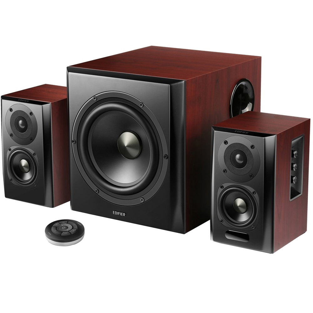 Most 2.1 systems include tiny satellite speakers and make up for the small sound from satellites with their subwoofers. With the S350DB you get both a massive subwoofer and fully featured bookshelf speakers. Connect your sources via Bluetooth, RCA, optical, coaxial or AUX with these. Take full control of your audio with the side panel controls on the side of one of the bookshelf speakers. Three knobs are located on the side that affect the bass, treble and volume for the entire 2.1 system. Once switched on, the power light will appear on so you know your system is working. Receive deep satisfaction from the rumbling lows from the S350DB when the 8-inch subwoofer is activated during playback. Movies, music, and games come to life when you have this subwoofer attached and producing sound. This subwoofer has an enhanced side panel bass reflex port. This reflex port enhances your listening experience for all types of bass sounds. Enjoy deep rumbling lows from your favourite movies, music, games and so much more with this 2.1 system. The S350DB is equipped with two bookshelf satellite speakers that have titanium dome tweeters that aid in producing a sound that provides clear highs in any genre of music, videos and movies. The titanium dome tweeters are ¾-inch in size. Switch between inputs and control playback with the wireless remote for the S350DB. Switch between optical, coaxial, auxiliary and Bluetooth inputs from a range. Also, control the volume or playback controls, as well as, switch the speakers on or off with the wireless remote. Features Bluetooth 4.0, Qualcomm aptX, Optical input with 24Bits/48KHz decoding, 150W RMS total power, Titanium dome tweeters, aluminium diaphragm mids & 8" subwoofer, Digital Signal Processing (DSP) and Dynamic Range Control (DRC), IR remote control, Universal power supply Specifications, Power output: R/L(treble): 15W+15W, R/L(midrange and bass): 25W+25W, SW: 70W, Signal to noise ratio: R / L: 80dB (A); SW: 85dB, Distortion: R/L: 0.2%; SW: 0.2%, Frequency response: R/L: 160Hz -20KHz; SW: 40Hz –160Hz, Input sensitivity: PC: R/L: 600±50mV; SW: 270±20mV, AUX: R/L: 400±50mV; SW: 200±20mV, Optical/Coaxial:R/L: 400±50mFFS; SW: 200±20mFFS, Bluetooth: R/L: 400±50mFF; SW: 200±20mFFS, Input type: PC, AUX, Optical, Coaxial, Bluetooth, Bass unit: 8”, Mid-range and bass: 3,5”, Treble driver: 3/4” titanium top treble, Voltage: 100-240V, Speaker Dimensions: Subwoofer: 312 x 265 x 289 mm, Satellites: 156 x 127 x 217mm