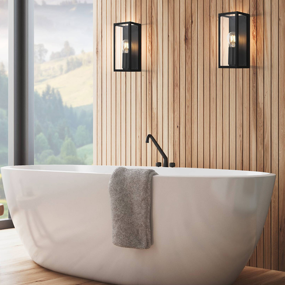 Add a touch of industrial chic to your decor with this EGLO Amezola Caged Industrial Wall Light. The wall light has a black metal frame and clear glass panels with a visible lightbulb design. Enhance the vintage feel in your bathroom with a large retro-style lightbulb. With its industrial-inspired design, the unique cage structure not only exhibits modern style but also enhances the diffusion of light. The product has IP44 protection against spray water and requires 1 x E27 lightbulb, which is not included. Please click here to find our range of lightbulbs.