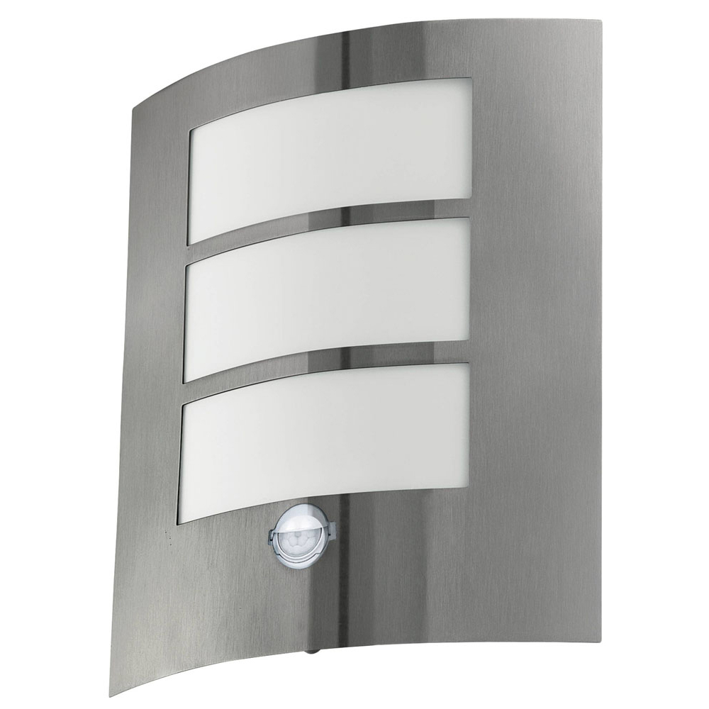 Embrace the magic of lighting decor with this EGLO City Silver Exterior Sensor Wall Light. The modern wall lamp features a curved design and stainless steel finish with three white plastic diffuser elements. Additionally, it adds security to your home with the integrated sensor, which has a detection angle of 90 degrees and up to seven metres. With IP44 protection against spray water, the exterior light is suitable for outdoor use, and the classic design adds a contemporary touch to the exterior of your home, offering increased security with the integrated sensor. The product requires one E27 lightbulb, which is not included.