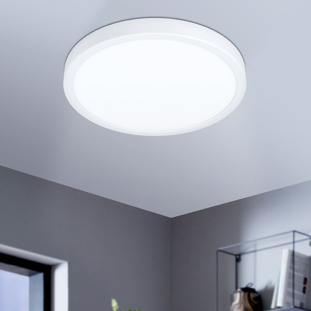 Illuminate your house with the Eglo Fueva 5 White Round Integrated LED Flush Light 3000K. It is made of white metal with a height of 28 mm and blends with almost any home living trend. With integrated LEDs covered by a white light diffuser, it produces neutral white light. Due to its slimline profile, this ceiling light can also be used easily as a wall light. The high-quality light has no visible screws on its housing, and the special ceiling bracket makes installation extremely straightforward. The surface-mounted light’s classic design and neutral white task light make it perfect for areas needing good lighting, such as the kitchen, hallway, utility room or office. Please click here to find our range of lightbulbs.