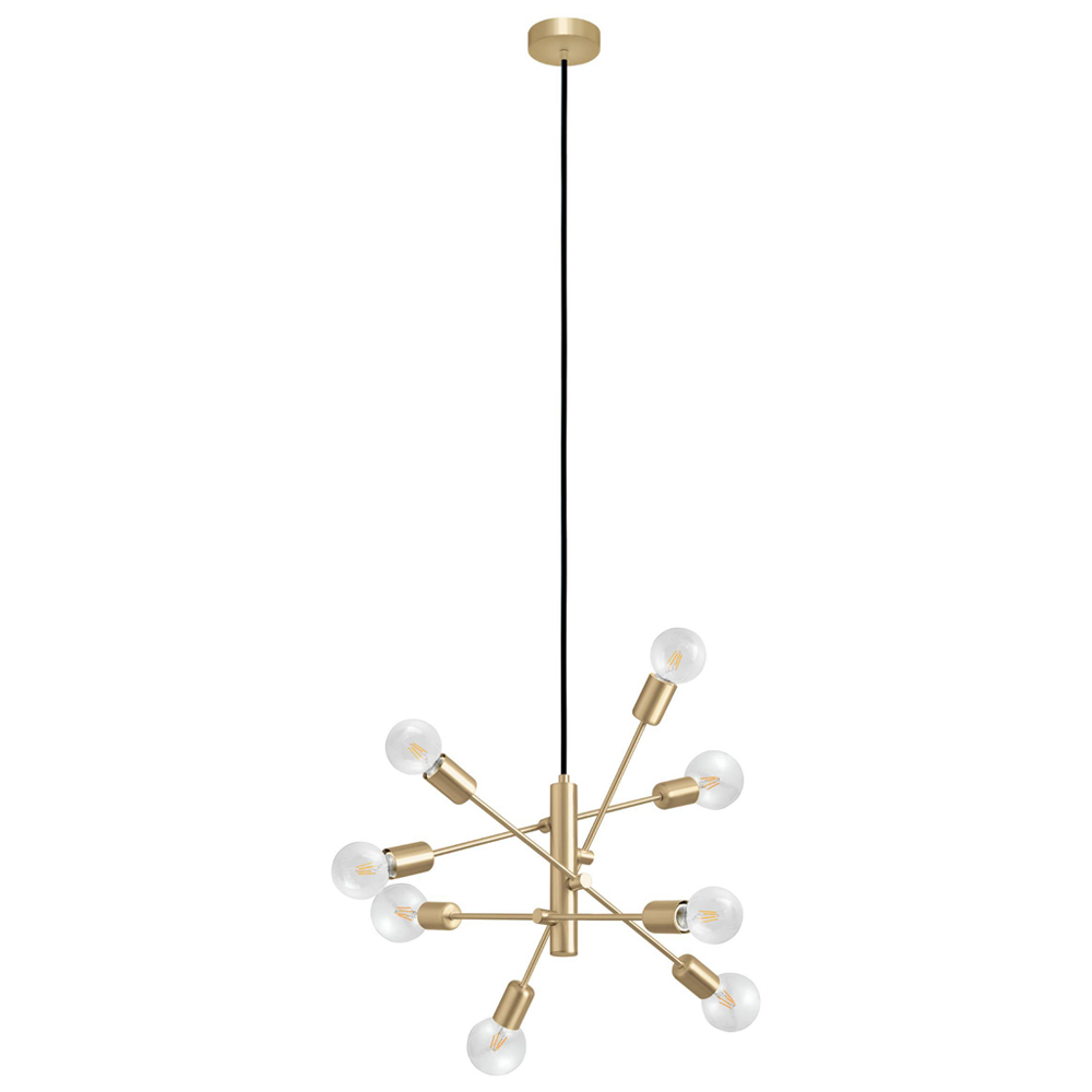 The Gradoli 1 Pendant Light from EGLO features a durable steel structure with a brushed brass finish. Its offset, linear arms are adjustable to create a personalised lighting fixture to complement your style. With a starburst design, eight exposed lightbulb sockets and a black textile cable, this pendant light complements elegant and futuristic interiors. The pendant light blends seamlessly into modern interiors, creating a focal point in any space, whether in the living room or above the dining room table. The light requires eight E27 lightbulbs, which are not included. IP20 Rating. Please click here to find our range of lightbulbs.