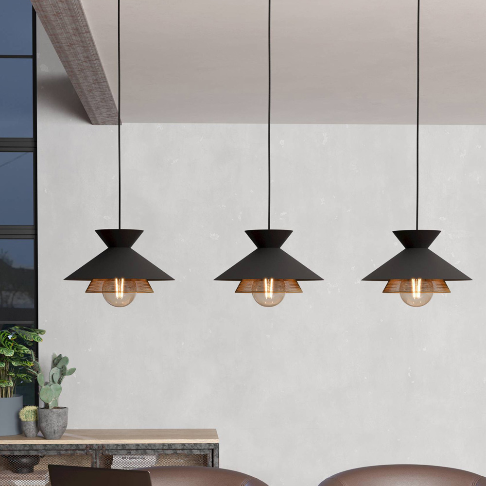Enhance the ambience of your living space with the EGLO Grizedale pendant light. Its sleek and modern design features a steel structure adorned with three black conical lampshades, each housing an inner brass-coloured shade. The combination of brass and black creates a visually striking effect. Drawing inspiration from Japanese design trends, this pendant light seamlessly complements Japandi-styled interiors while adding a touch of industrial flair. Whether placed in the living room or suspended above the dining room table, this light fixture provides stunning ambient illumination. Please note that the product requires 3 x E27 lightbulbs, which are not included. It also boasts an IP20 rating for added safety. Please click here to find our range of lightbulbs.