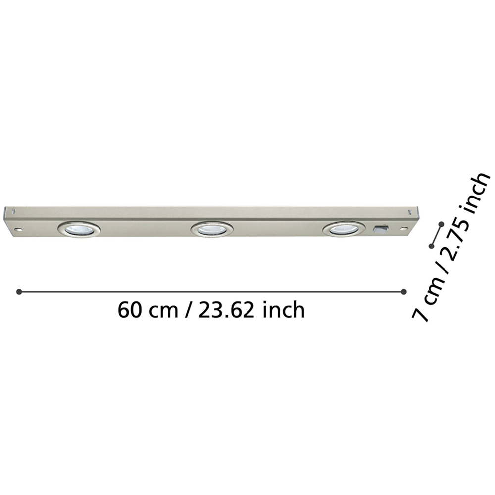Elevate your space with the Eglo Kob Satin Nickel Under Cabinet LED Light. This sophisticated 60 cm light features a matte nickel metal finish. Its integrated LEDs emit a pleasant, warm white light, ideal for illuminating kitchen worktops. Controlling the light is effortless with a convenient rocker switch on the housing. This luminaire's minimalist and modern design blends into any home decor style.