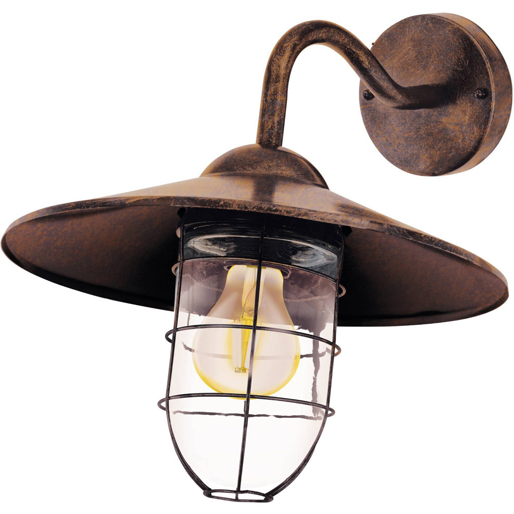 Add a vintage charm to your outdoor space with this EGLO Melgoa Copper Exterior Wall Lamp. The lantern-style wall light features a zinc-plated metal body in an antique copper-coloured finish with a bistro-style shade over a cylindrical clear glass shade, which has cage detailing around it. With IP44 protection against spray water, the wall light is the perfect choice for a house entrance, terrace or balcony. The product can be corner mounted and requires one E27 lightbulb, which is not included. Pair it with a retro-style lightbulb to maximise the vintage feel.
