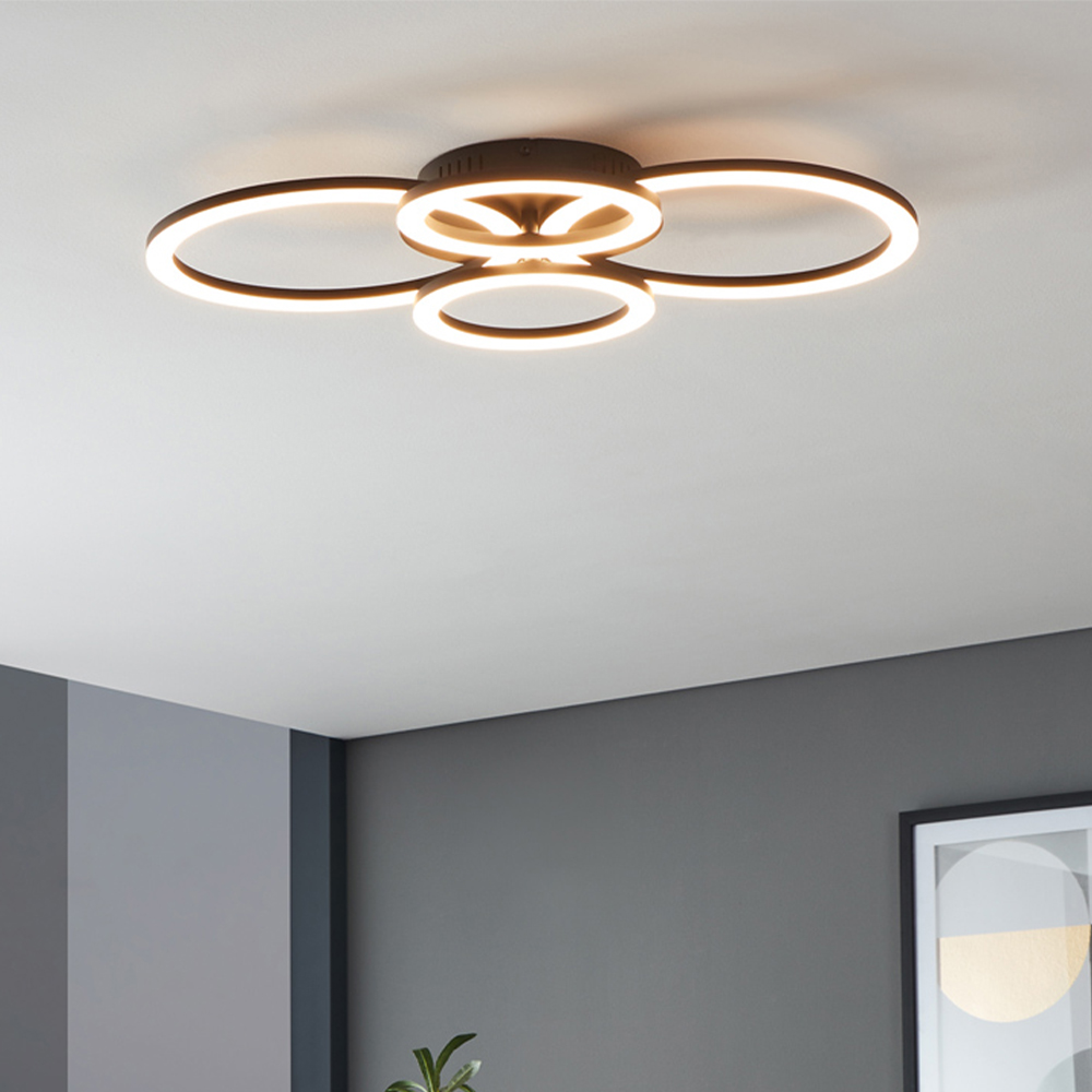 Illuminate your home with the Eglo Parrapos-Z Modern Black Smart Control Colour Changing Ceiling Light 45cm. This elegant light features four round black LED profiles, two large and two small. They are attached to the centre of a round steel base. The integrated LEDs, positioned behind white plastic light panels, offer a pleasant and customisable light that can be adjusted to warm white, neutral white, or cool white. The minimalist design seamlessly complements most modern interiors. Easily control the lighting with the free AwoX HomeControl app, which offers functions such as brightness adjustment, timer operation, and presence simulation. The ceiling light is also compatible with Bluetooth and Zigbee 3.0, allowing voice assistant control. Please click here to find our range of lightbulbs.