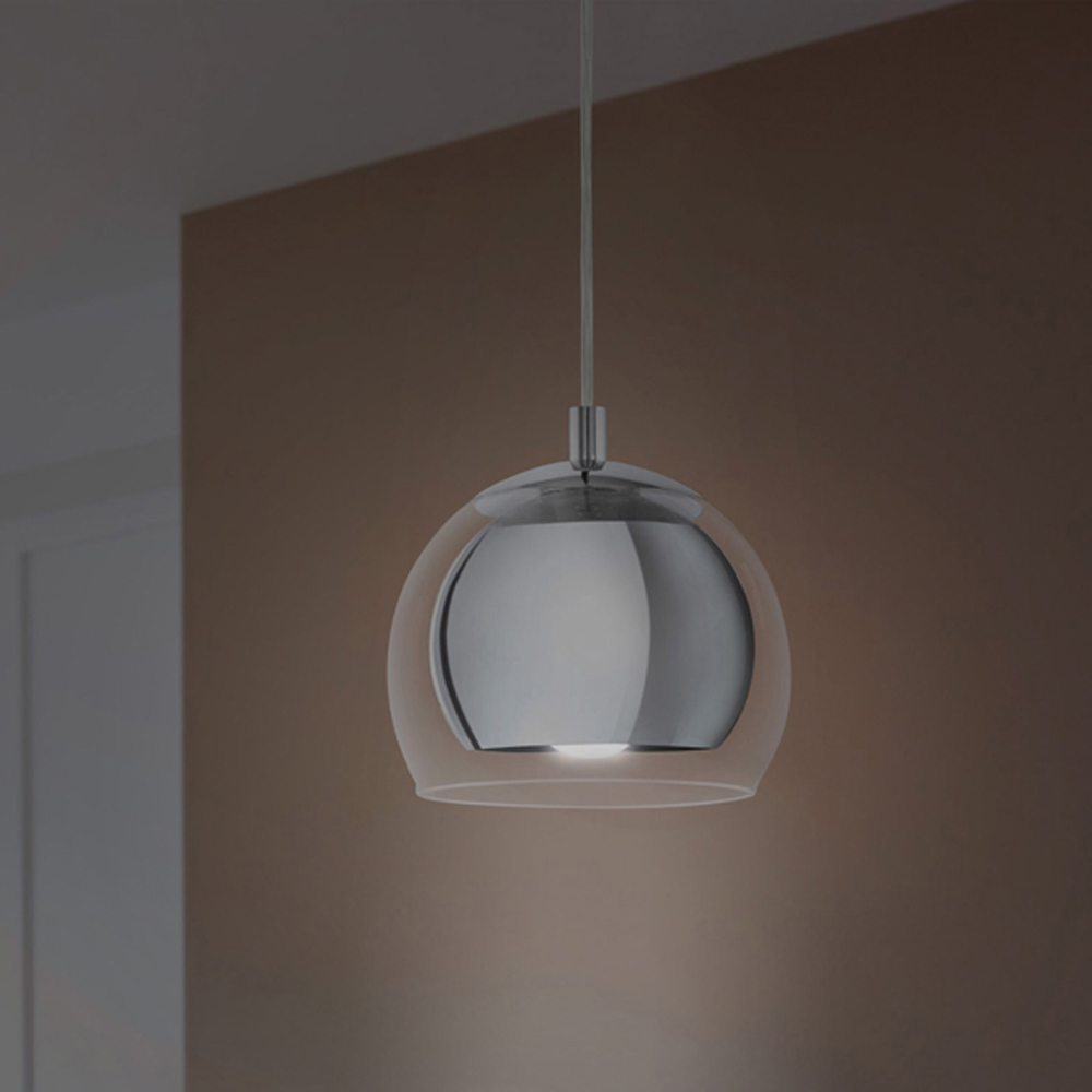 Add cosy and beautiful lights to your indoor space with this EGLO Rocamar Chrome Pendant Light. This pendant light has a spherical clear glass shade surrounding an inner metal cylinder in a chrome finish for added style. Apart from this, the design has a round chrome-coloured metal canopy to make a perfect addition to your home. The elegant pendant light features a simple design and superbly complements modern interiors, providing stylish lighting in the living room or dining room above the dining table. The product has an E27 lamp holder and requires one E27 lightbulb (not included).  Please click here to find our range of lightbulbs.