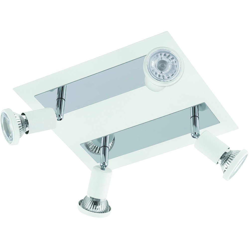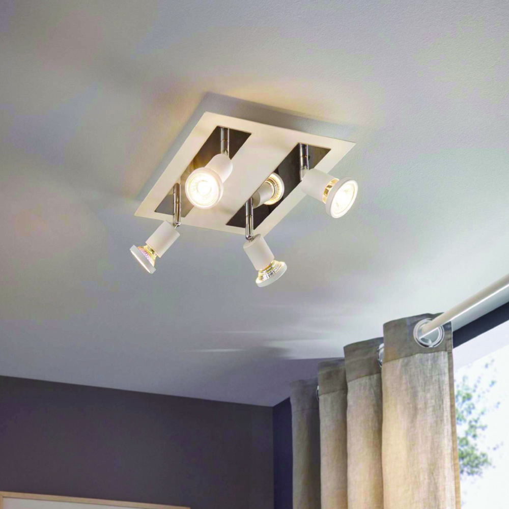 The EGLO Sarria White 4 LED Metal Ceiling Light features a square white metal frame, along with four adjustable spotlights in the same white metal finish. This fixture is enhanced with stylish chrome-coloured metal accents, seamlessly blending with its minimalist design. The pivoting spotlights allow you to adjust the light to accentuate individual areas of the room, whether in the kitchen, the living room, the bedroom or the hallway. The product includes GU10 LED lightbulbs, which produce a pleasant warm white light. Please click here to find our range of lightbulbs.