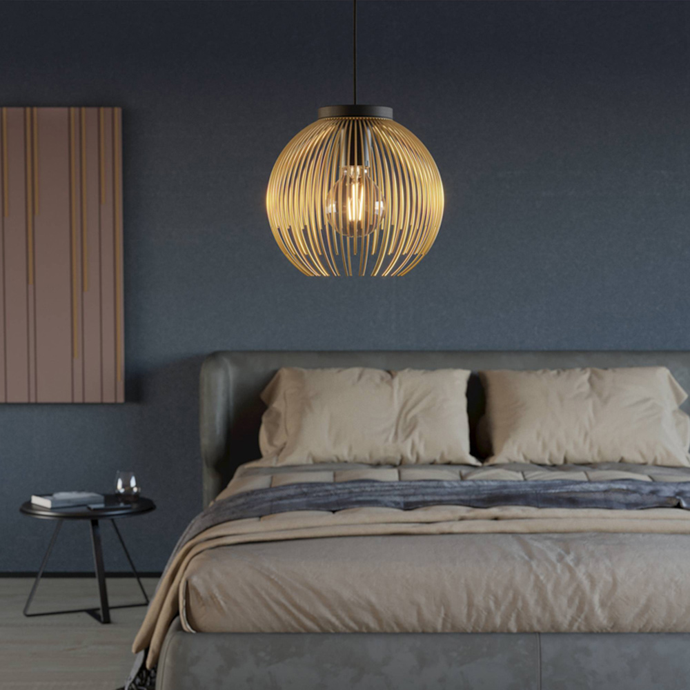 Illuminate your home with EGLO Venezuela Gold and Black Pendant Light. The pendant light features a gold-coloured wire lampshade suspended from a round black metal canopy on a black textile cable. The wire shade curves harmoniously over the lightbulb and generates a fascinating display of light and shadow. It complements modern interiors and blends seamlessly in any living room or above the dining room table. The product has an E27 lamp holder and requires a 1 x E27 lightbulb, which is not included. Please click here to find our range of lightbulbs.