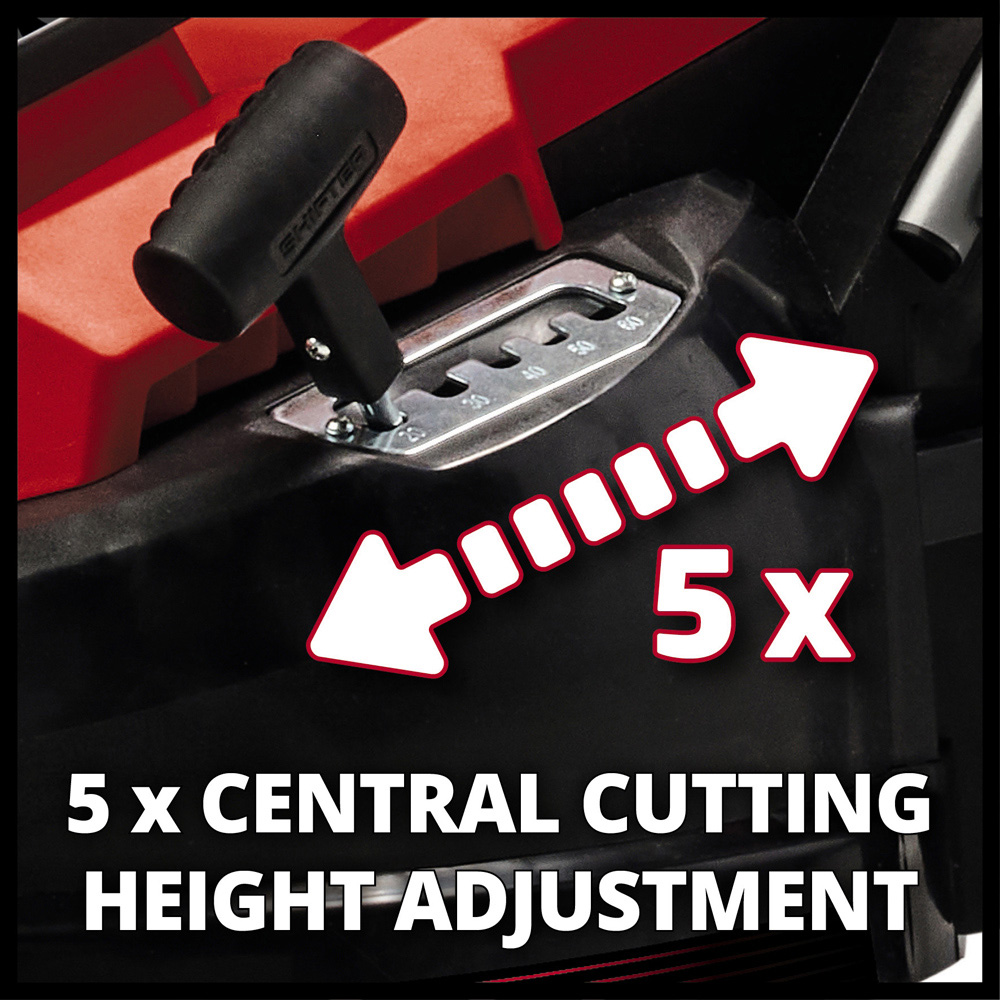 Powerful motor with an output of 1,600 W Recommended for lawn areas up to 700 m² 5-level central cutting height adjustment (20 - 60 mm) Foldable guide rail for space-saving storage 38 litre grass collection box with filling indicator Highwheeler with large, lawn-protecting wheels Robust folding push handle made of powder-coated steel Integrated carrying handle for easy transport