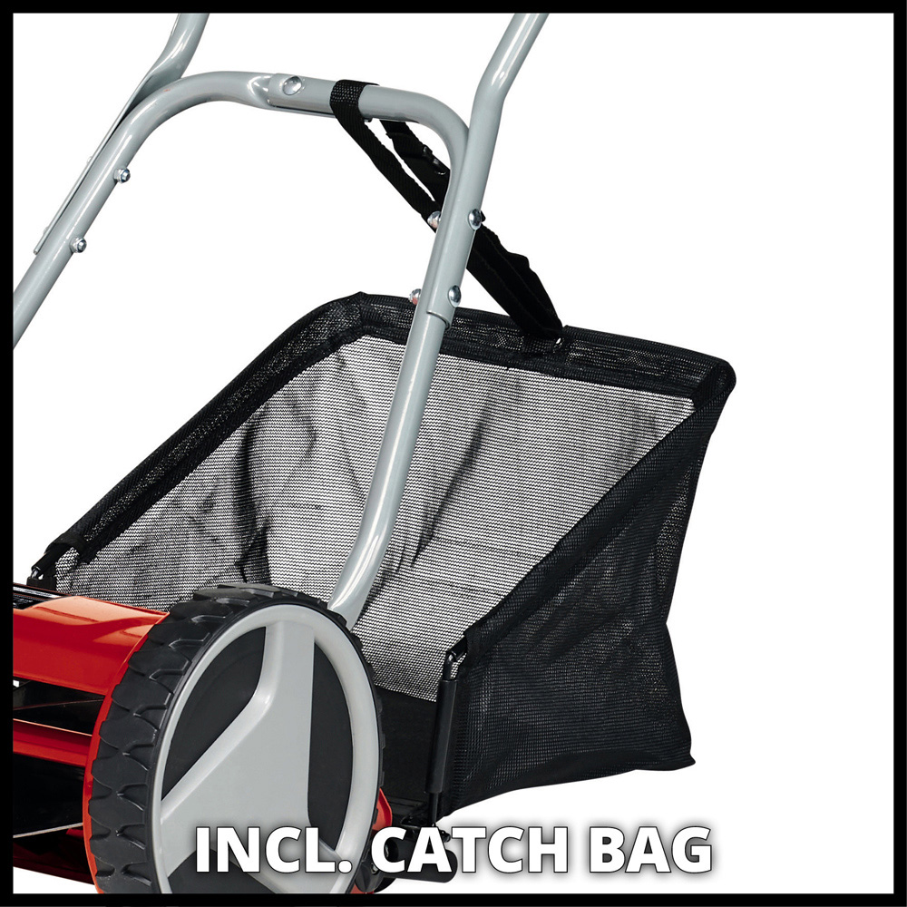 The Einhell GC-HM 300 cylinder lawn mower is a robust, functional lawn mower without a motor drive, for the clean, quiet and environment-friendly mowing of lawns of up to 150 m² in size. The ball-bearing mounted mower spindle with five high-grade steel blades is designed for a cutting width of 30 cm. The cutting height adjustment facility with 4 levels can be adjusted to individual requirements between 13 mm and 37 mm. The plastic roller has a diameter of 45 mm. The cylinder lawn mower has lawn-friendly large wheels. A curved long handle provides optimum on-the-job ergonomics, and there is a parking position for easy and secure storage of the lawn mower. The 16 litre grass catch basket is removable and easy to empty.