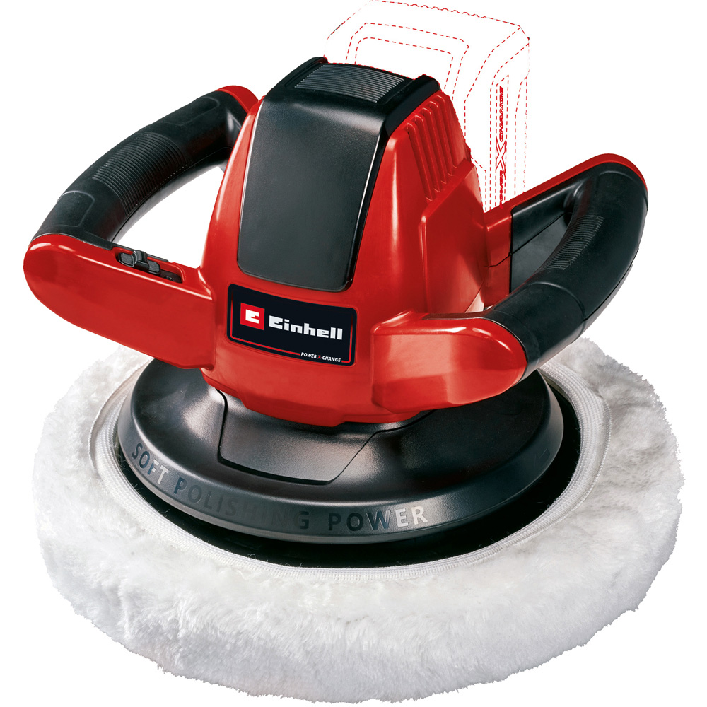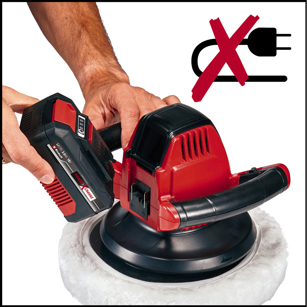 Use the Einhell CE-CB 18/254 Li-Solo cordless car polishing machine to quickly polish your car to a mirror finish, independent of stationary sources of electricity thanks to the Li-ion battery. The battery from the Power X-Change family can be used in all the devices from the system series and is available separately. For long service life, the polishing machine is user-friendly and robust, while the Softgrip provides a perfectly firm hold. The powerful 2,500 revolutions per minute and the polishing disk Ø 254mm ensure effective polishing. For safety, there is an ON/OFF switch and overload protection. It is supplied complete with a textile polishing bonnet for applying the polishing agent and a synthetic polishing bonnet for finishing off.
