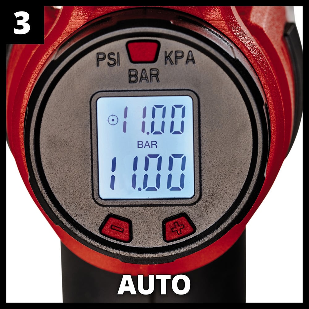 The Einhell CE-CC 18 Li-Solo cordless car air compressor is a member of the Power X-Change family and is ideal for inflating car tyres, wheel tyres and balls. Delivery does not include a battery or charger, but these are available separately. The cordless car air compressor has integrated storage for the three-piece inflation adapter set and an ergonomic handle. The desired pressure up to a maximum of 11 bar can be set effortlessly using the digital pressure display. When the target pressure is reached, the car air compressor switches off automatically. You can select between bar, psi and kpa via a push button. Manual inflation is possible at any time without presetting. Delivery includes a 60cm compressed air hose.