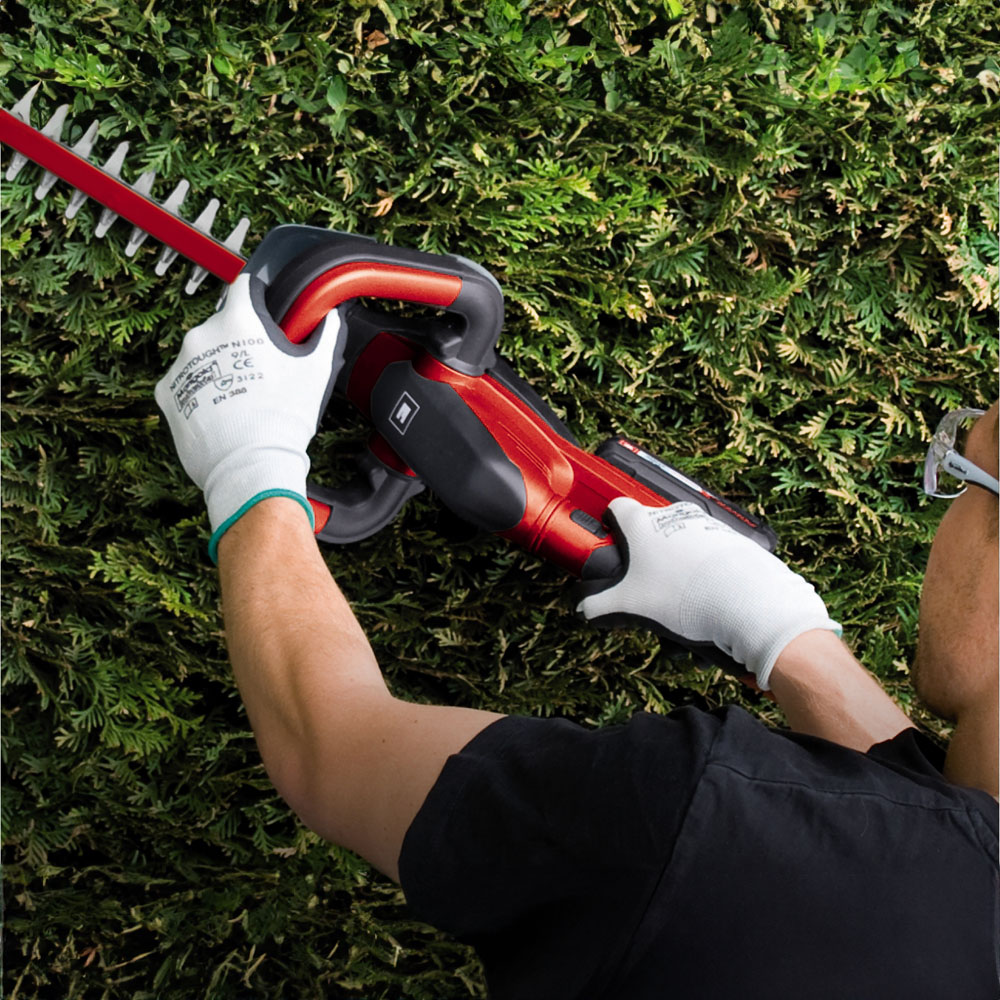 The GC-CH 1846 Li cordless hedge trimmer is an efficient tool which thanks to its low weight and handy size provides good service for the trimming of hedges, shrubs and bushes on large grounds and allotments where there is no connection to the electric power grid. For a long service life the gearing is made of metal, for clean cutting results the blades are made of laser-cut and diamond-ground steel.