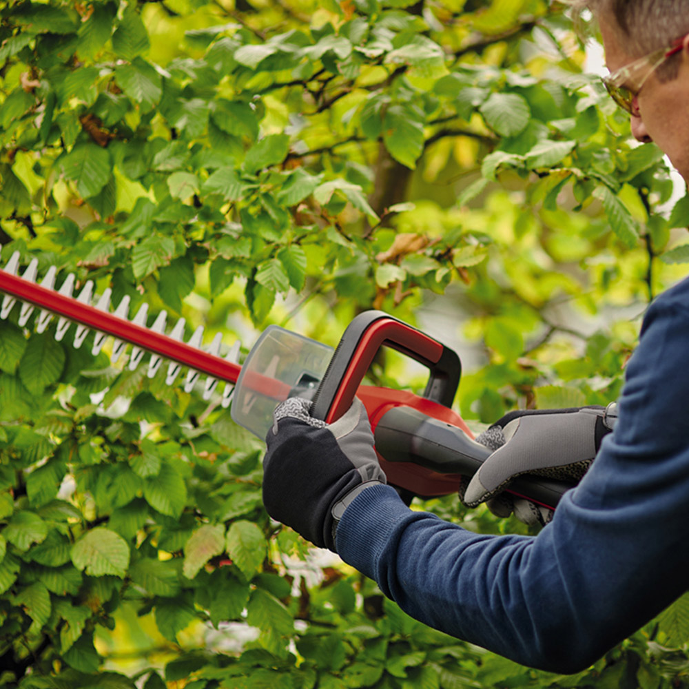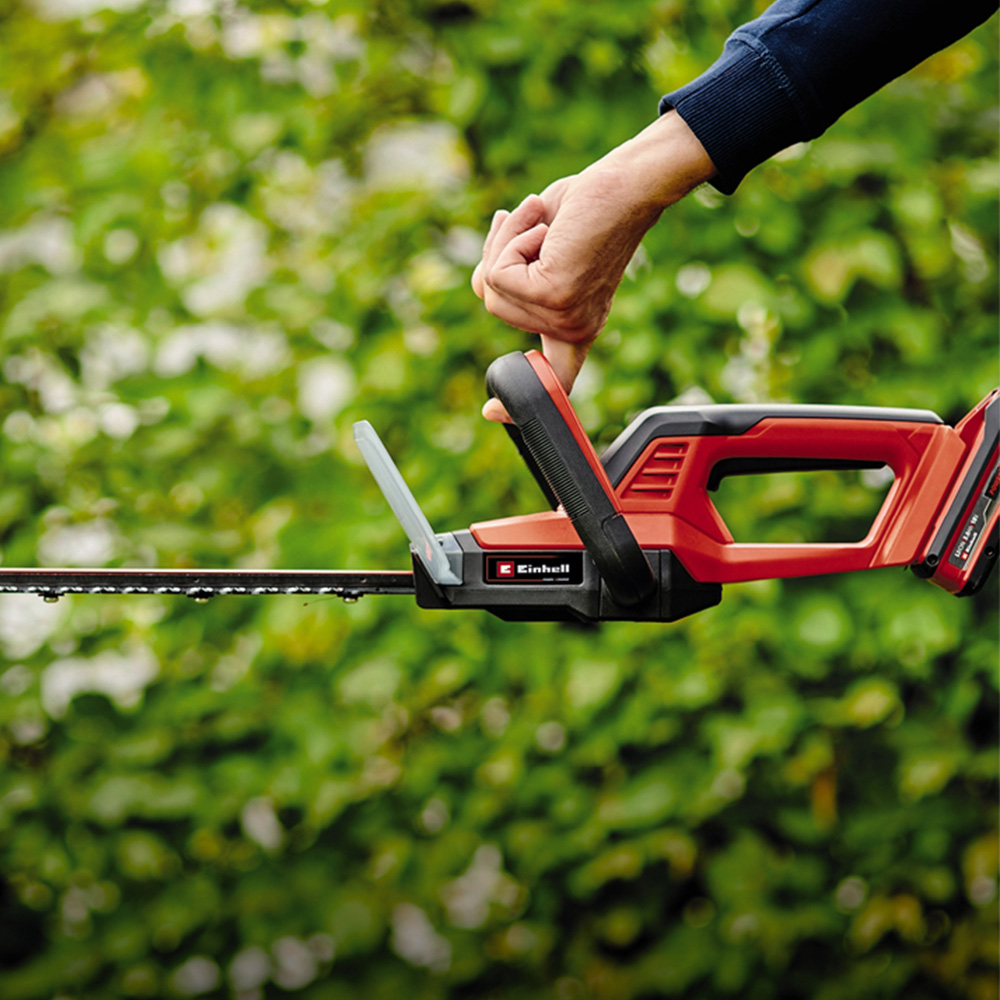 The Einhell cordless hedge trimmer GC-CH 18/50 Li Solo is a small, lightweight and handy hedge trimmer from the Power X-Change series. The durable robust metal gearbox ensures the perfect transfer of the battery-power to the laser-cut and diamond-ground steel blades. The hedge trimmer is equipped with a 2-hand safety switch, a rotating rear handle and a large front handle. An aluminium blade cover to protect the blades as well as shock protection with a bracket for wall mounting and a sturdy case for storage and transport are included in the delivery. 1x 18 V battery from the flexible Power X-Change series is required for the operation of the cordless hedge trimmer. Delivery does not include a battery or charger.