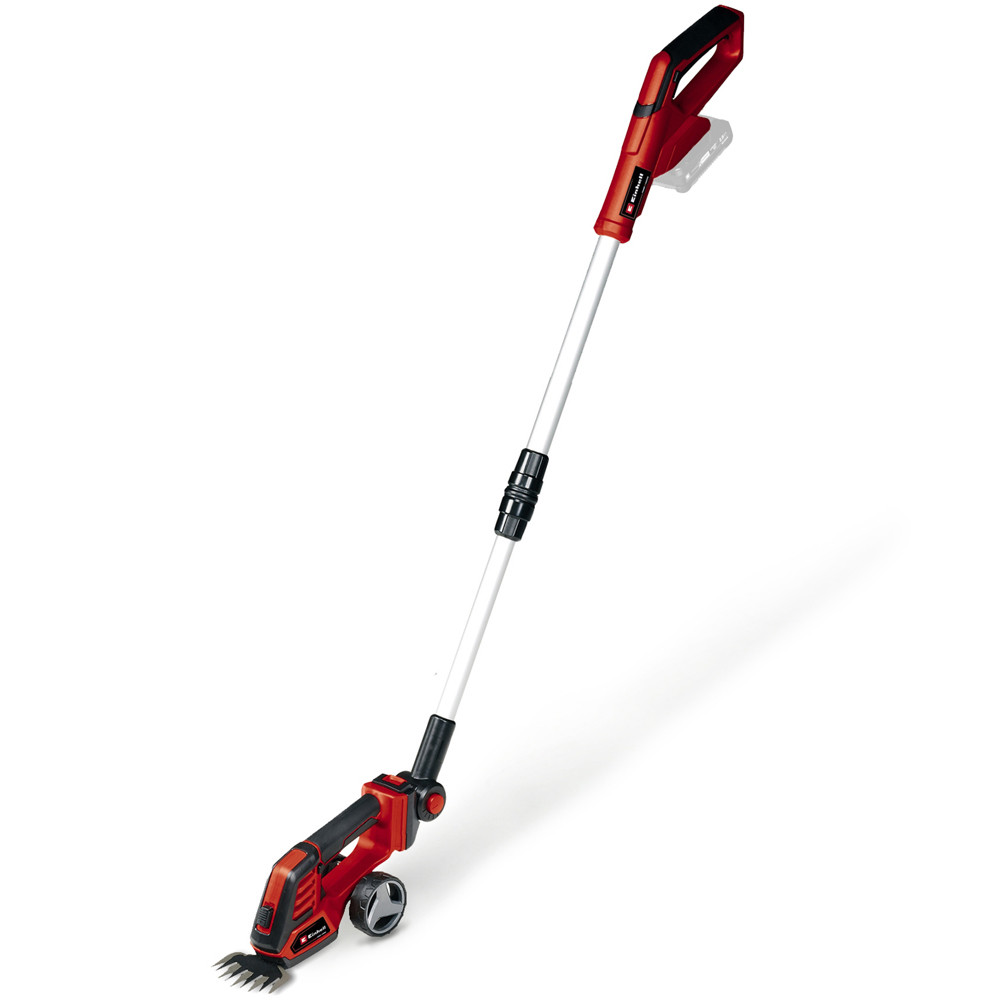 The Einhell cordless grass and shrub shears GE-CG 18/100 Li T-Solo are a powerful member of the smart Power X-Change family. The grass-cutting blade (100mm) is ideal for lawn edges, while the laser-cut and diamond-ground shrub shear blades (200mm) are perfect for trimming bushes and hedges. The blades can be exchanged without tools. In use, the Softgrip provides perfect handling and ergonomics. The kit includes a telescopic extension which is especially convenient for certain tasks. The covered gearbox housing protects against accidental contact with transmission oil. One 18 V Power X-Change battery is required for operation. Battery and charger are not included. These are available separately.