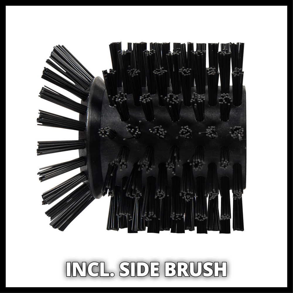 The Einhell PICOBELLA 18/215 cordless surface brush is a multifunctional supporter to clean stone, wood, artificial turf and edges. As a member of the Power X-Change battery system, every system battery can be used. The PICOBELLA 18/215 has an integrated garden hose connection, a water control valve, an all-round dirt guard hood, extra-wide rotating brush rollers, flexible forward/reverse operation and infinitely adjustable speed control. The brushes can be changed at the press of a button. A special side brush is perfectly suited for perimeter work. The additional handle has an integrated garden hose guide. The product is supplied complete with a MEDIUM brush for cleaning stone. This product comes without a battery or charger.