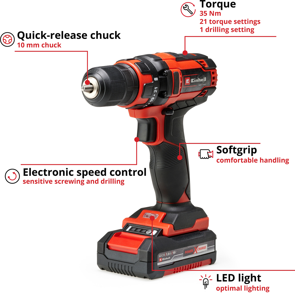 The Einhell TC-CD 18/35 Li (1x1.5 Ah) cordless drill/screwdriver is a member of the established PXC series and is ready for action thanks to state-of-the-art li-ion technology with zero self-discharge. The PXC rechargeable batteries can be used in any of the tools from the PXC system series without restriction. Equipped with one 1.5 Ah battery and a one-hour charger, it provides the user with flexibility for performing all main drilling and screwdriving jobs. Electronic speed control ensures that the tool can be adjusted to the particular material/application. For optimum operation in dark areas, there is LED lighting. The ergonomic design & softgrip provide easy handling and a firm, secure grip. It is supplied in a practical storage box.
