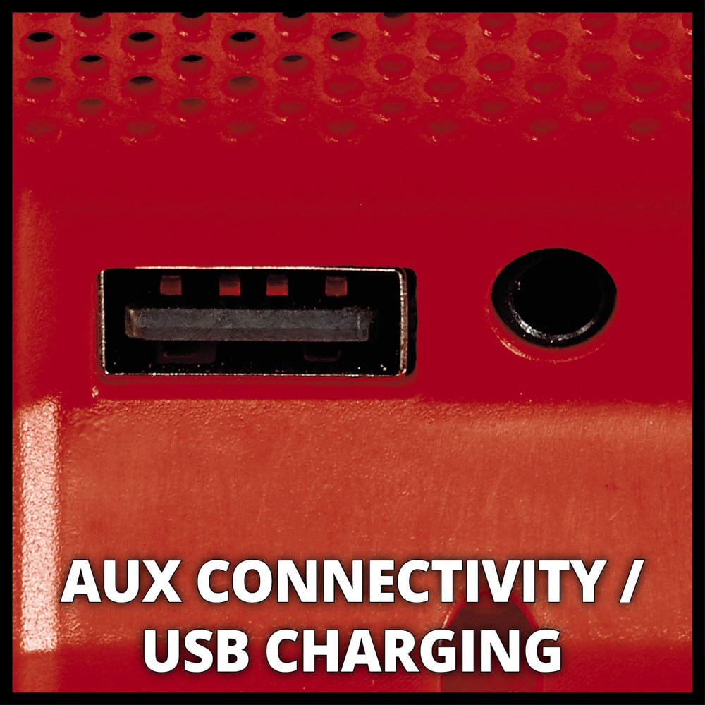 With the Einhell cordless speaker TC-SR 18 Li BT – Solo, you can easily connect to all Bluetooth-enabled devices such as smartphones or tablets. In addition, the speaker has an AUX port for connecting MP3 players or smartphones, and a USB port for charging smartphones, tablets or MP3 players. The intuitive control panel allows easy handling. As a member of the Power X-Change family, all high-quality lithium-ion batteries in the system range can be combined with the cordless speaker. Delivery does not include a battery or charger. These are available separately, e.g. as a practical starter kit.
