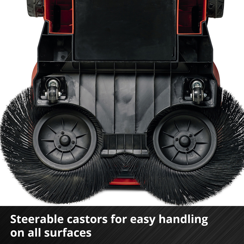 The Einhell TE-SW 18/610 Li-Solo cordless mechanical sweeper is a member of the flexible PXC family. The battery and charger are available separately. The cordless machine needs one 18 V rechargeable battery. The mechanical sweeper assists with sweeping work, enabling you to sweep up without strain or effort using a battery-assisted brush-drive, right up to the edges thanks to the brushes positioned on the side. Especially for sweeping up large areas at up to 1,800 m² per hour thanks to the 610 mm sweeping width, it makes light work of keeping large yards tidy. The On/Off switch is located on the handle itself. For easy handling, it has large swivel rollers and an ergonomic shape. Complete with a 20-liter dirt tank that can be set down.