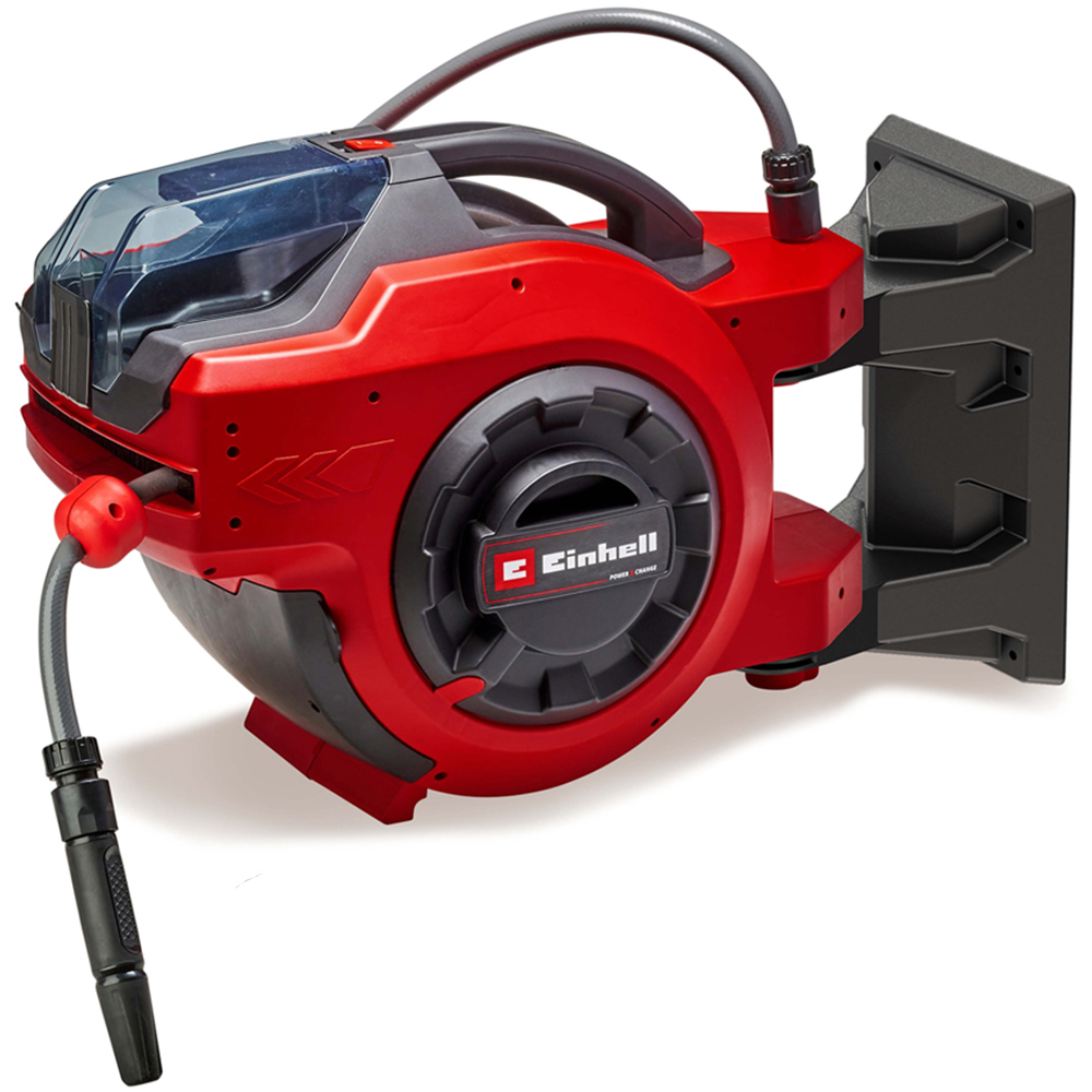 The powerful 18 V Power X-Change battery enables the Einhell cordless hose reel GE-HR 18/30 Li-Solo to automatically retract your 30 m-long garden hose (12,5 mm / 1/2""). The hose guide and cleaning brushes ensure clean the hose is as it is reeled in, while the stopper ball stops the motor automatically to prevent damage. The hose reel is UV-resistant and splash-proof and can be used as a portable unit or installed on a wall. The wall bracket and the supplied tap adapters make mounting and connection easy. The reel can be swivelled through 180° and comes without battery or charger. It does include a hose with a garden sprayer. The Einhell cordless hose reel GE-HR 18/30 Li-Solo waters the garden like never before. Putting the hose away manually is a thing of the past thanks to the powerful 18 V Power X-Change battery. At the push of a button, the included 30 m-long, 12.5 mm (1/2"") diameter UV-resistant garden hose is automatically wound onto the hose reel. The stopper ball, suitable for 12.5 mm (1/2"") hoses, which come pre-mounted on the hosepipe, stops the motor automatically to prevent damage. As the hose is wound back onto the reel, the hose guide and the cleaning brushes on the feed clean the hose as it is retracted and ensure it doesn't kink. The hose can be extended to any intermediate length as desired. The hose drum is made of UV- and splash-proof plastic, providing optimal weather resistance. Water and moisture can be removed from the housing using the residual water drain provided on the drum. The cordless hose reel can be used both as a portable unit and in a fixed position. The included wall bracket provides the perfect way to mount the reel on the wall of a house or shed. The mounting allows it to be pivoted 90° to the left or right. With the permanently installed 1.5 m-long, 12.5 mm (1/2"") diameter connection hose and the appropriate adapters for common tap sizes (1"", 1/2"", 3/4""), the hose reel can be connected to a tap. A hose cart, sold separately, enables the cordless hose reel to be used for mobile lawn irrigation. The kit also includes three Aquastop quick couplings and a garden sprayer. The cordless hose reel comes without a battery or charger. These are available separately.
