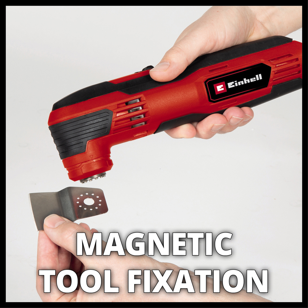 The multifunctional tool TC-MG 250 CE impresses with its powerful 250 W motor, speed electronics for material- and application-oriented work, constant electronics for constant power and switch with locking function. The 12-way adjustable magnetic tool adapter allows easy changing and optimal positioning of the accessory. The multifunctional tool has an oscillation angle of 3°. Delivery includes a tool-free dust extraction device and a triangular sanding plate, 9x sandpaper (3x P60, 3x P80, 3x P120), a scraper, a plunge saw blade and a hexagon key for tool change.