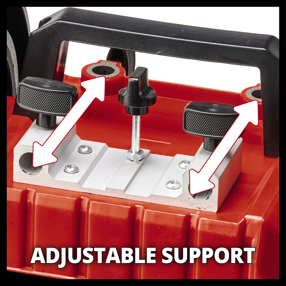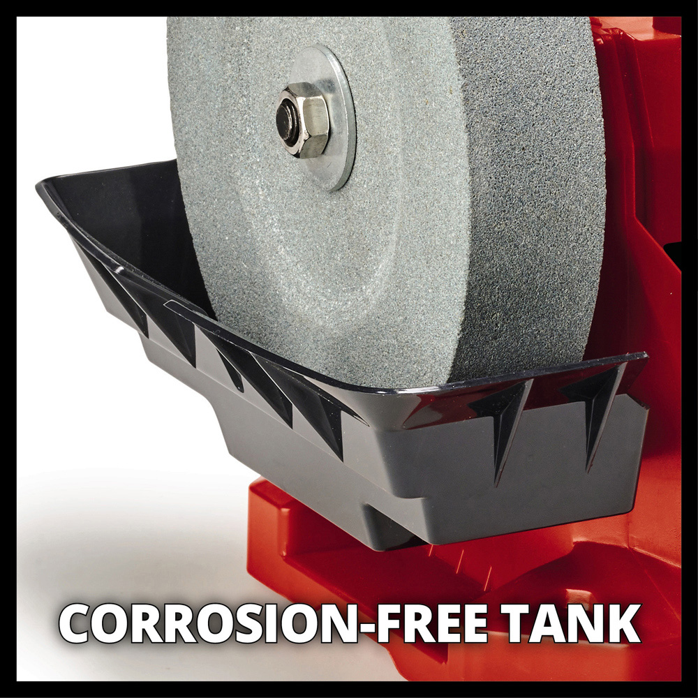 The Einhell wet sander TC-WG 200 is ideal for sharpening tools without damaging the workpiece to be machined. The universal device provides flexibility, while the corrosion-free water tank cools the workpiece. The angle gauge for adjusting the sanding angle is included in delivery. The sanding wheel can be prepared with the grindstone. Four rubber feet damp vibrations and ensure firm and secure standing. Delivery includes a slow-running, fine-grained wet sanding wheel and a leather grinding wheel for removing burrs.