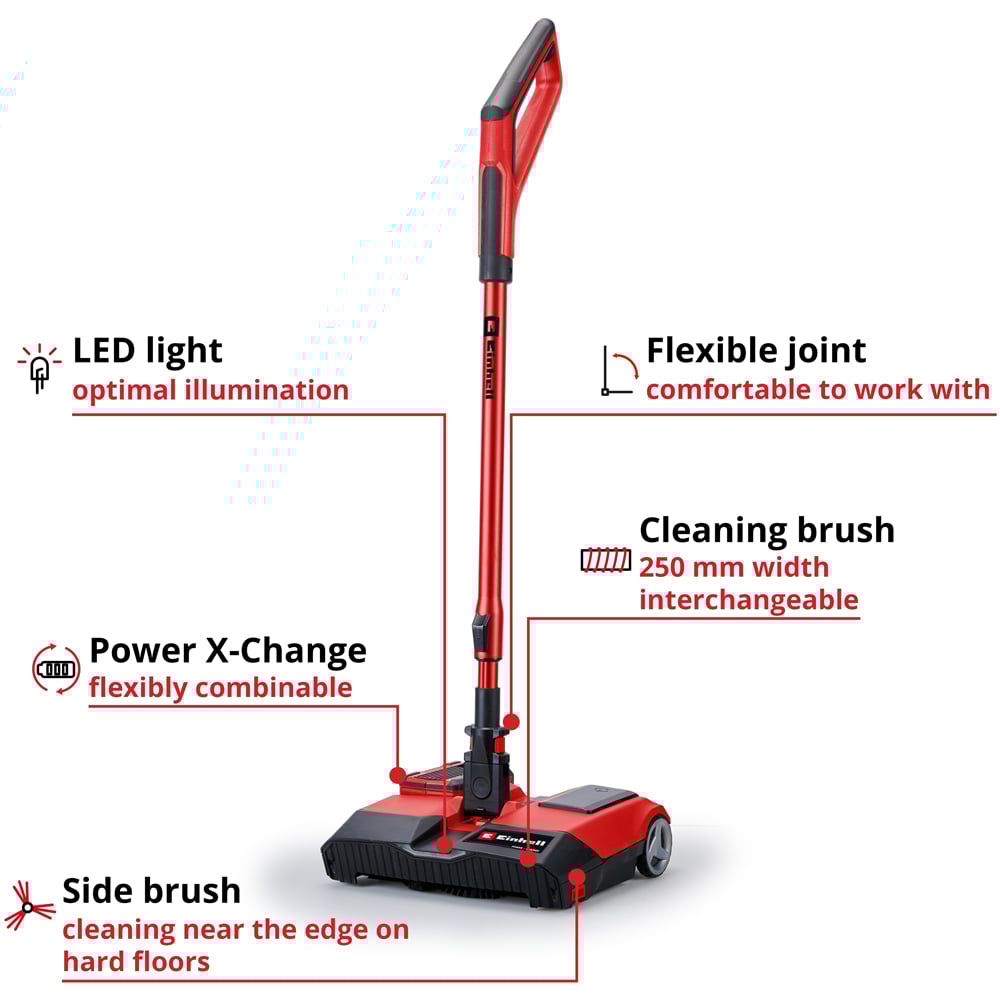 The Einhell TE-FS 18 Li-Solo cordless sweeper is the ideal helper for cleaning tasks. As a member of the Power X-Change family, the sweeper can be combined with all batteries and charging devices across the system. Its flexible swivel joint makes it easy to clean. Rubberised wheels help with manoeuvring. Its compact and lightweight design enables fatigue-free sweeping with the telescopic handle. The 250mm wide cleaning brush removes dry dirt from all hard floors. This ends up in a 400ml collecting container. The TE-FS 18 Li cordless sweeper comes with three side brushes and one cleaning tool. Delivery does not include the battery or charging device, which are sold separately.