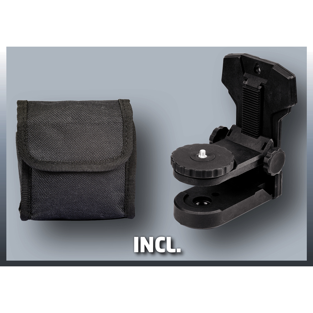 The Einhell 360° laser level TE-LL 360 is an ideal tool for installation, renovation and laying jobs. The horizontal 360° laser line makes easy work of aligning objects to the same level in rooms. The TE-LL 360 projects a horizontal and a vertical laser line, is self-levelling and has an LED for warning the user if the angle deviates by more than four degrees. The self-levelling time is five seconds. The TE-LL 360 can also be used as a digital spirit level. For use with a tripod, there is an integrated 1/4-inch thread. Comfortable to handle thanks to a soft grip. Complete with a height-adjustable wall bracket for working comfort and a practical bag for storage.