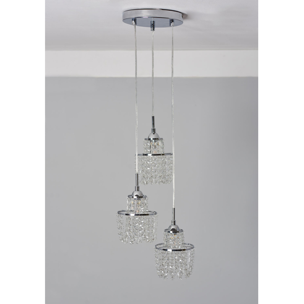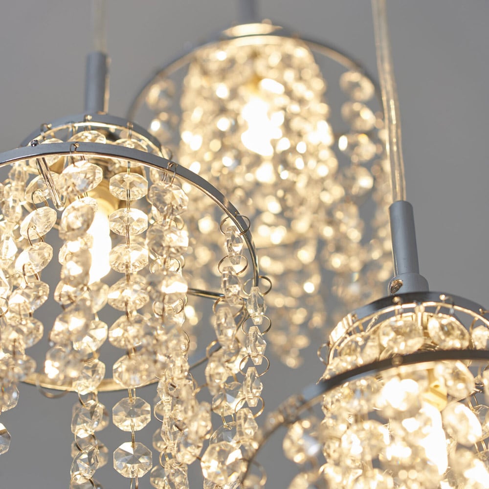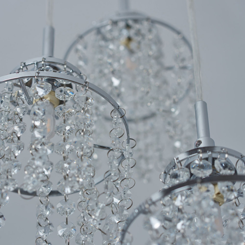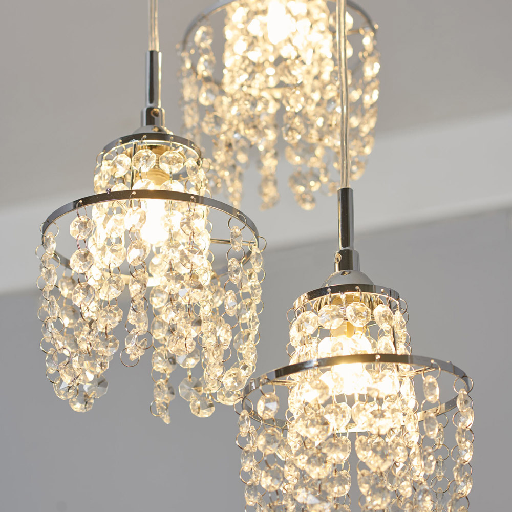 Full of grace and glamour, the 3 Light Elegance Ceiling Fitting will be the ultimate stand out a centrepiece of your decor. With three drops at different levels, each bulb will be surrounded by gathered diamantes and silver rings. When the lights are turned on, it will shine through the beads and give the impression of real diamonds, perfect for those who want to bring a lavish edge to their home. Please click here to find our range of lightbulbs.