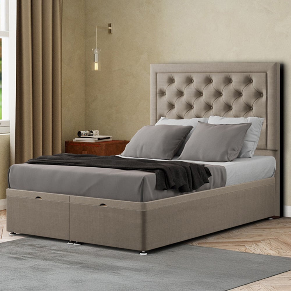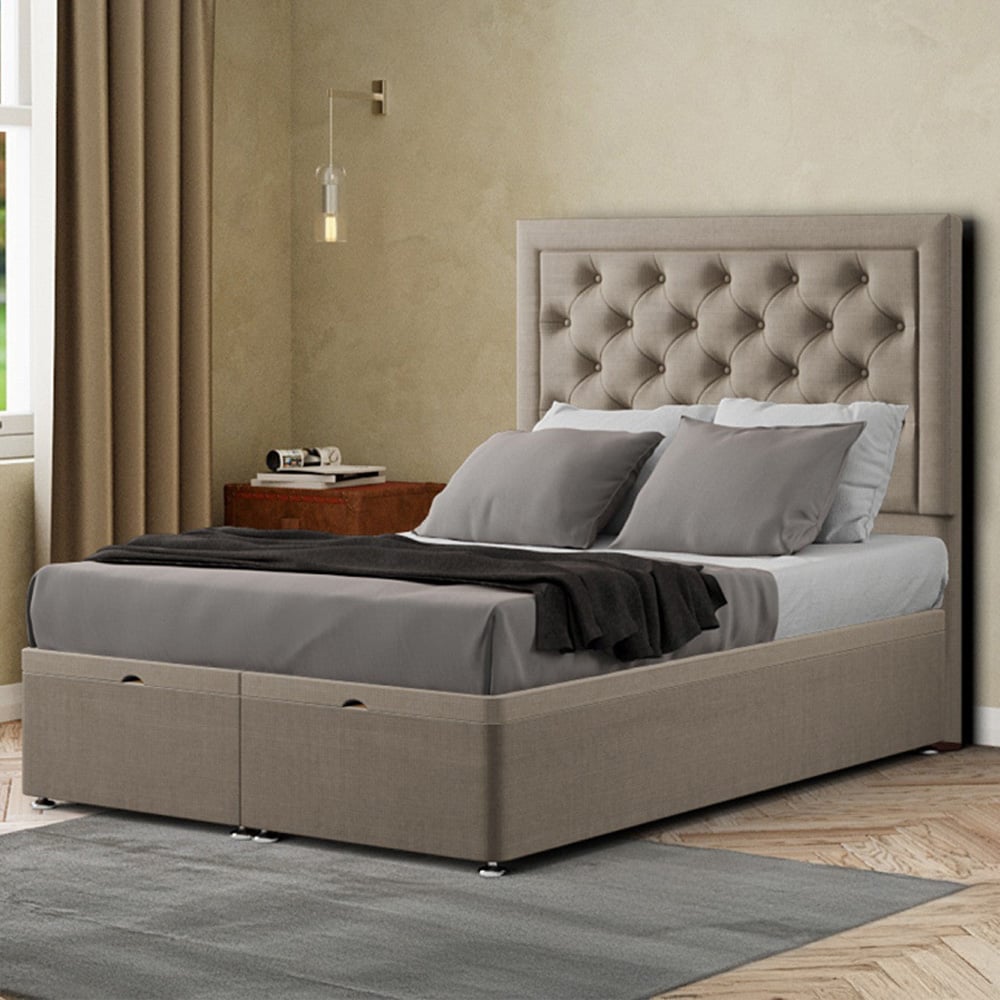 Eleganza Castle Small Double Beige Linen Ottoman Bed with Floor Standing Headboard
