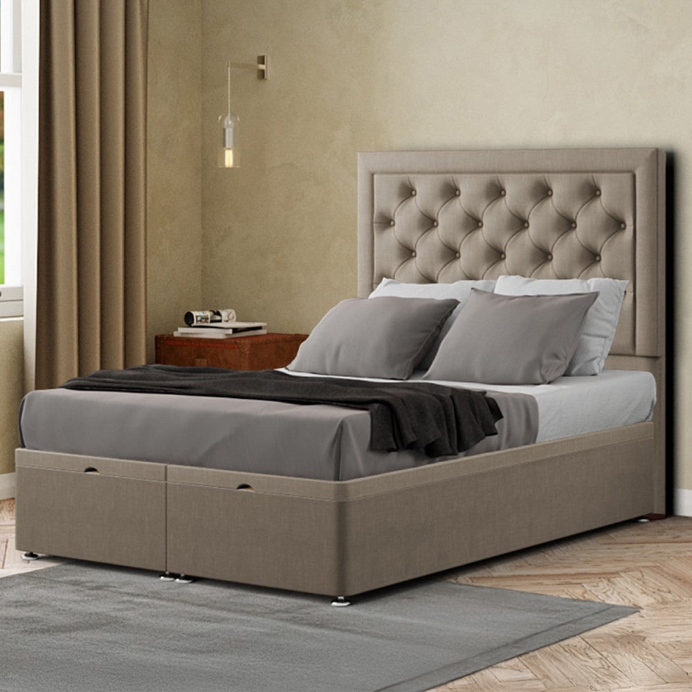 Introducing the Castle Gas Lift Ottoman End Lift Bed - Crafted with Precision in the UK for Uncompromising Quality! Impeccable Design: Elevate your bedroom with the floor-standing headboard adorned with matching buttons, exuding timeless elegance and sophistication. Customized Elegance: Express your unique style with a variety of colours and fabric choices, ensuring seamless integration with your bedroom decor. Available in All Sizes: Whether you need a single, small double, double, king, or super king, we have the perfect size to fit your space. Gas Lift Convenience: Effortlessly access the spacious storage area beneath the bed with the convenient gas lift mechanism, combining style with practicality. Premium Quality: Crafted with top-tier materials, this ottoman bed is built to last, providing you with years of dependable use. Mattress Not Included: Please note that the mattress is not included, allowing you to personalize your sleep experience. Elevate your bedroom with the Castle Gas Lift Ottoman End Lift Bed and experience the perfect blend of style, functionality, and quality. Create your own sanctuary of comfort—order yours today! Divan Ottoman End Lft, 54 inch Headboard - Does not include Mattress. Dimensions: 137 x 180 x 200cm.